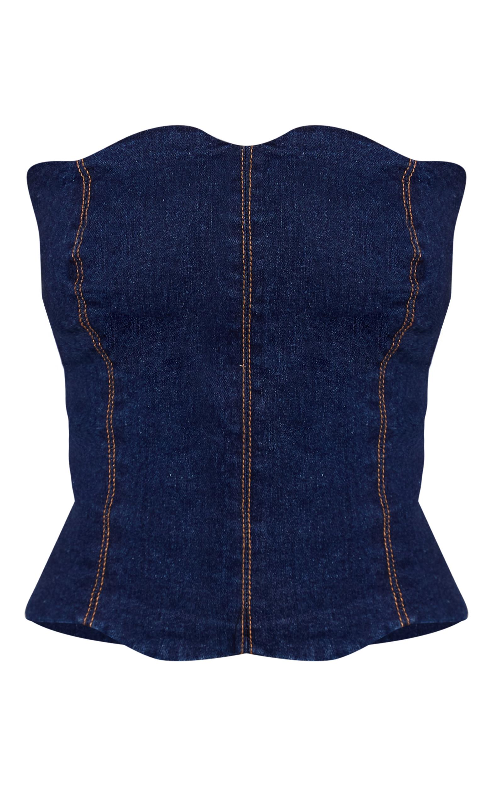 Capture the essence of refined denim with a top that delivers both structure and subtle artistry. The petite indigo denim scalloped edge bandeau top offers a confident silhouette in its rich blue hue, framed by a distinctive bandeau neckline with an elegantly scalloped finish. Defined vertical seam detailing enhances its tailored profile, ensuring a polished look for day. Wear this compelling piece with its coordinating denim mini skirt for a cohesive statement, completing the streamlined aesthetic with sharp kitten heels. A delicate gold ring offers a final, intentional detail to this effortlessly self-assured ensemble.Length approx 34.5cm/13.5inch (Based on sample size US 2)Model wears size UK 6/ EU 34/ AUS 6/ US 2Model Height - 5ft 2inchp]:!mb-4inch>Category: DenimProduct type: Denim CorsetColor: IndigoMaterial: Rigid DenimOccasion: Day