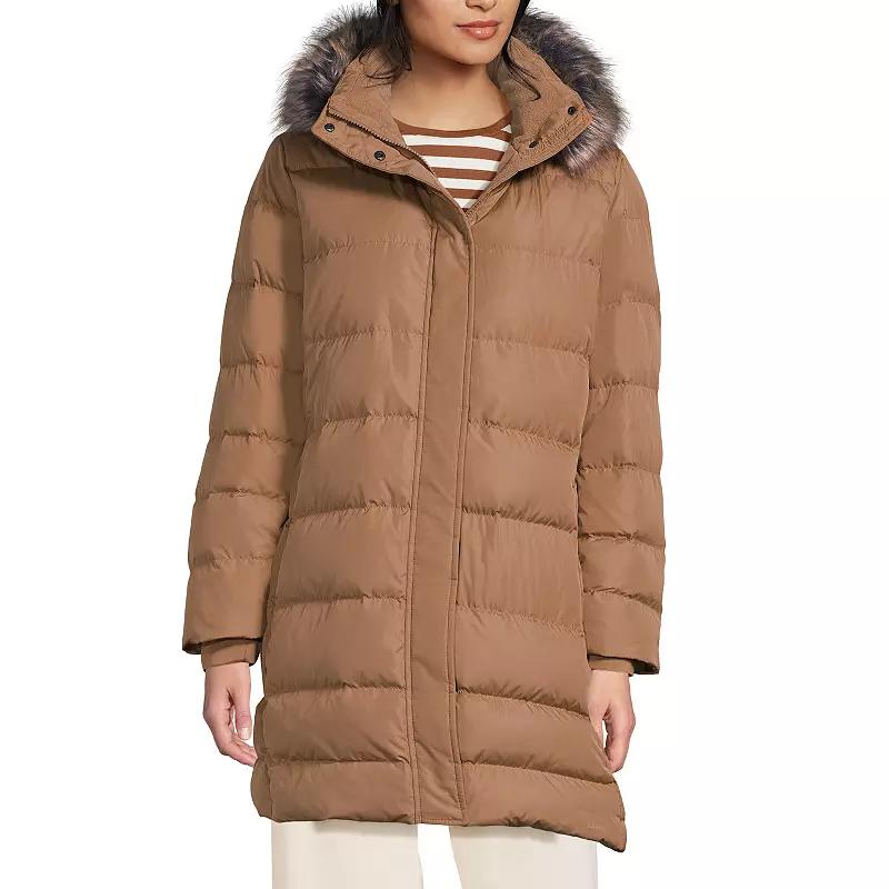 Gear up for the coming winter with this womens down puffer faux fur trim hooded winter parka coat from Lands End.Click on this WOMENS GUIDE to find the perfect fit and more! Gear up for the coming winter with this womens down puffer faux fur trim hooded winter parka coat from Lands End. Click on this WOMENS GUIDE to find the perfect fit and more! FEATURES Attached hood with removable faux-fur trim Snap & zipper closure Long sleeves Elastic cuffs Two functional inseam invisible zipper pockets, one functional interior snap pocket Water repellent, water resistant and wind proof technologies Smooth construction Fully linedFIT & SIZING Fitted 35-in. length from shoulder to hem Designed to hit above the knees HeavyweightFABRIC & CARE Body: polyester Fill: down Lining: polyester Trim: faux fur Machine wash Imported Size: S Petite. Color: Pink Frost. Gender: female. Age Group: adult.