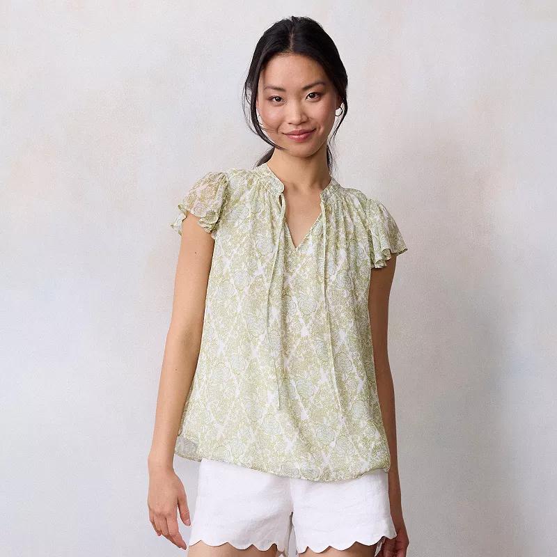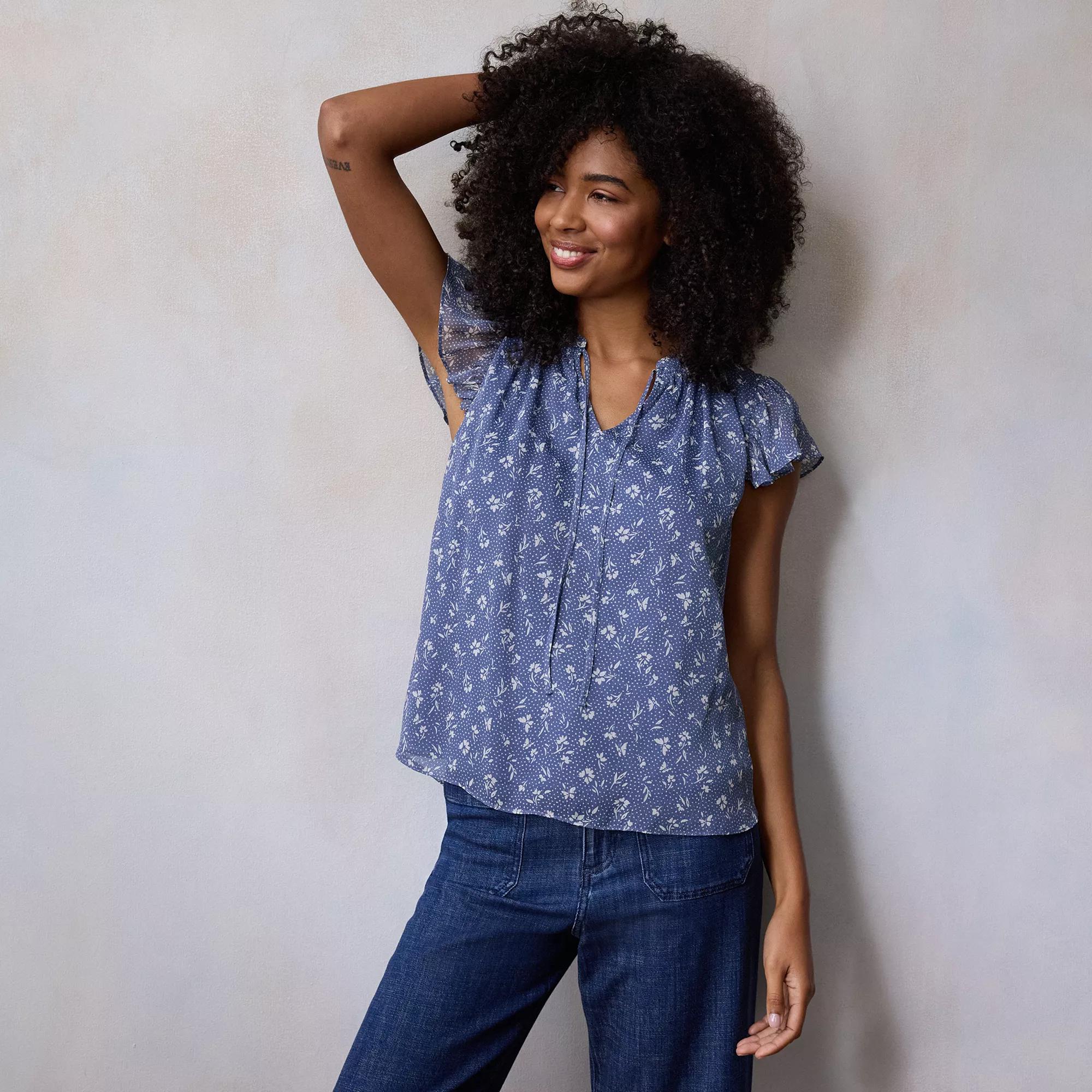 Update your wardrobe with this womens LC Lauren Conrad tie front ruffle v-neck shell top. Click on this WOMENS GUIDE to find the perfect fit and more!Update your wardrobe with this womens LC Lauren Conrad tie front ruffle v-neck shell top. Click on this WOMENS GUIDE to find the perfect fit and more!FEATURES Crinkle chiffon construction Rounded hem Short ruffle sleeves Fully lined V-neckFIT & SIZING Relaxed fit 24 1/2-in. length from shoulder to hemFABRIC & CARE Body & lining: polyester Machine wash ImportedRESPONSIBLE Tested for harmful substances STANDARD 100 by OEKO-TEX CERTIFIED Certification No. SE020 194919 Testing Institute: Testex AG: Swiss Textile Testing Institute www.oeko-tex.com/standard100 Size: S Petite. Color: Blue Dottie Fleur. Gender: female. Age Group: adult.