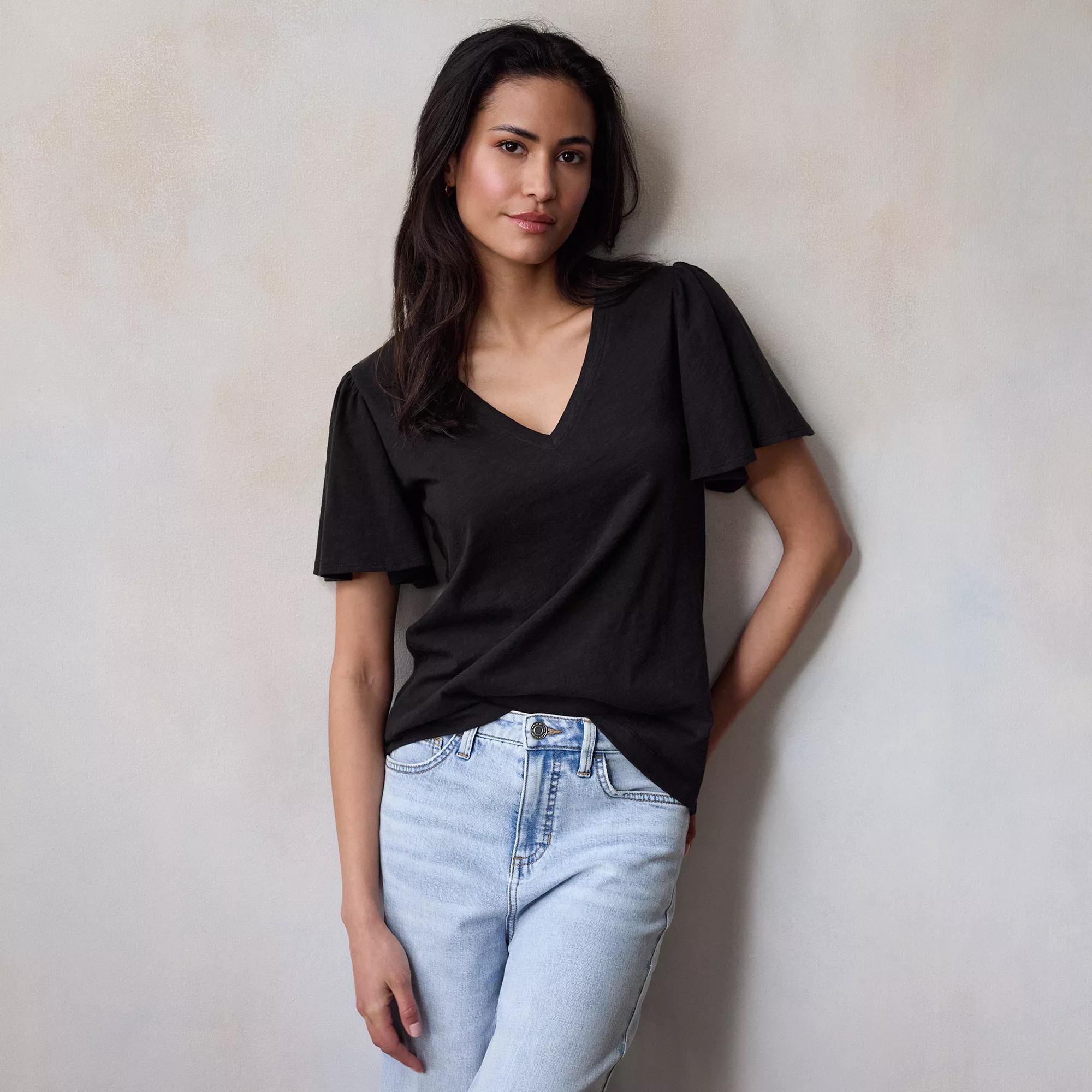 Feminine style calls for this Petite LC Lauren Conrad V-Neck Flutter Short Sleeve Top.Click on this WOMEN'S GUIDE to find the perfect fit and more!Feminine style calls for this Petite LC Lauren Conrad V-Neck Flutter Short Sleeve Top. Click on this WOMEN'S GUIDE to find the perfect fit and more!FEATURES Soft jersey construction Straight hem No closure - pullover styling Flutter sleeves Short sleeves V-neckFIT & SIZING 24-in. length from shoulder to hemFABRIC & CARE Cotton Machine wash and tumble dry low ImportedRESPONSIBLE Supports more sustainable cotton farming Size: M Petite. Color: Black Ore. Gender: female. Age Group: adult.