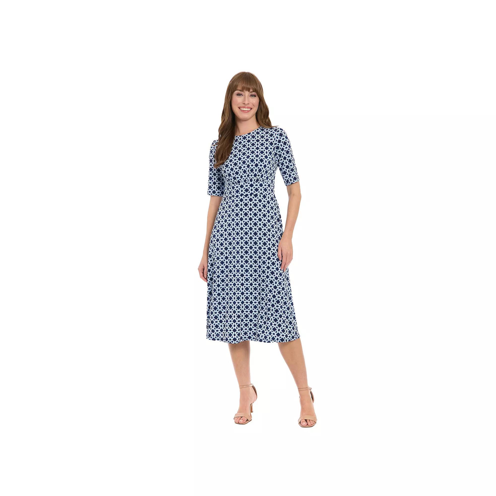 Take the stress out of finding the perfect dress with this women's printed midi a-line dress from London Times.Click on this WOMEN'S GUIDE to find the perfect fit and more! Take the stress out of finding the perfect dress with this women's printed midi a-line dress from London Times.Click on this WOMEN'S GUIDE to find the perfect fit and more! FEATURES Crewneck Elbow length sleeves Inset waist Straight hem Partially lined Jersey constructionFIT & SIZING 42 3/4-in. length from shoulder to hem A-line silhouette Midi length hits below the knee Zipper closureFABRIC & CARE Polyester, spandex Lining: polyester Machine wash and tumble dry low Imported Size: 12 Petite. Color: Navy. Gender: female. Age Group: adult.