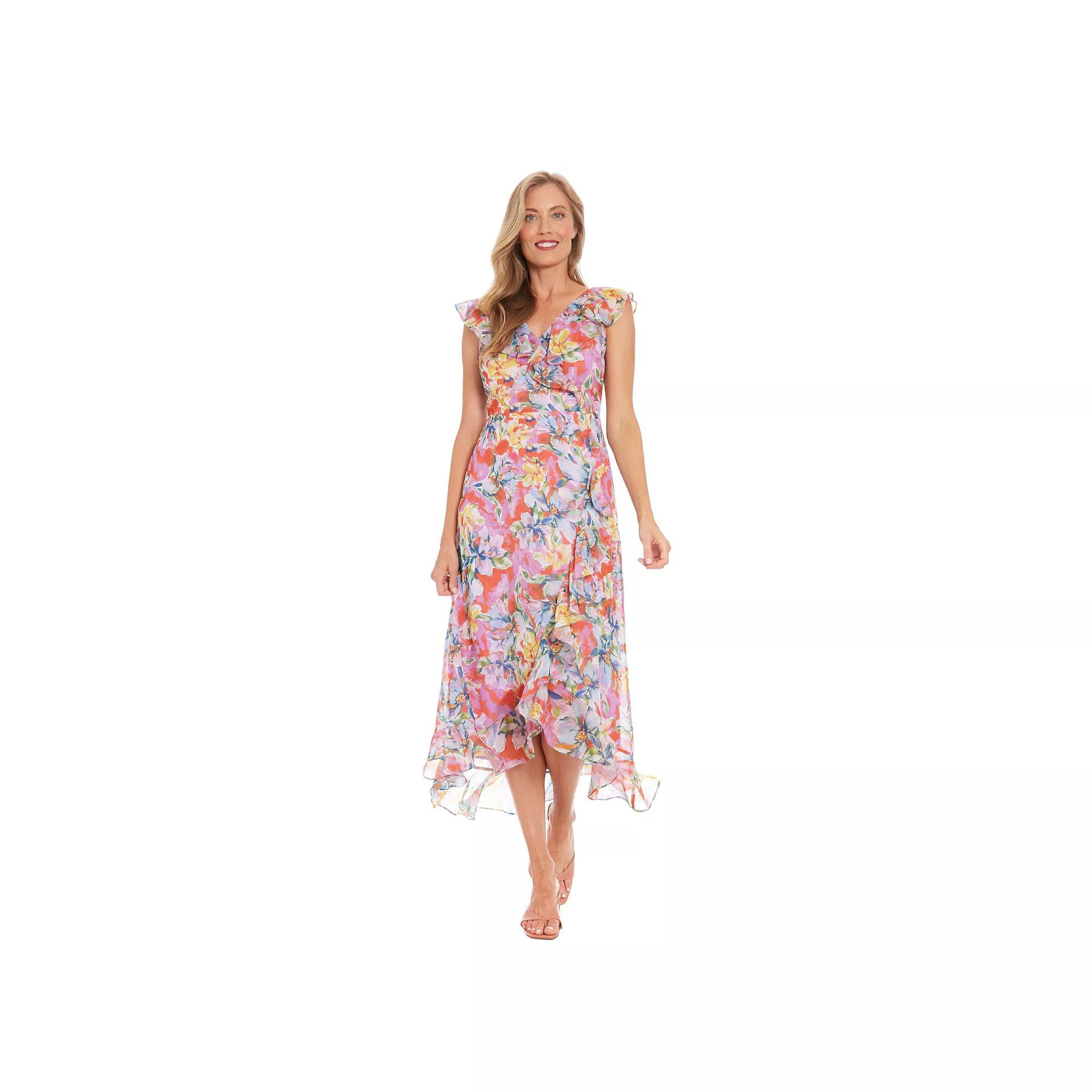 Flatter your figure in this Petite London Times Ruffle Wrap Maxi Dress.Click on this WOMEN'S GUIDE to find the perfect fit and more!Flatter your figure in this Petite London Times Ruffle Wrap Maxi Dress. Click on this WOMEN'S GUIDE to find the perfect fit and more!FEATURES Faux-wrap silhouette Chiffon with metallic detail 0 pockets High-low hem Zipper back Flutter sleeves Cap sleeves Fully lined V-neckFIT & SIZING 52 1/2-in. length from shoulder to hem Maxi length hits at the ankleFABRIC & CARE Polyester Machine wash Imported Size: 12 Petite. Color: Pink. Gender: female. Age Group: adult.