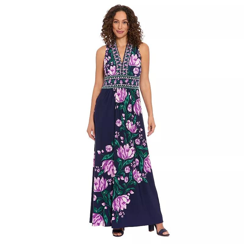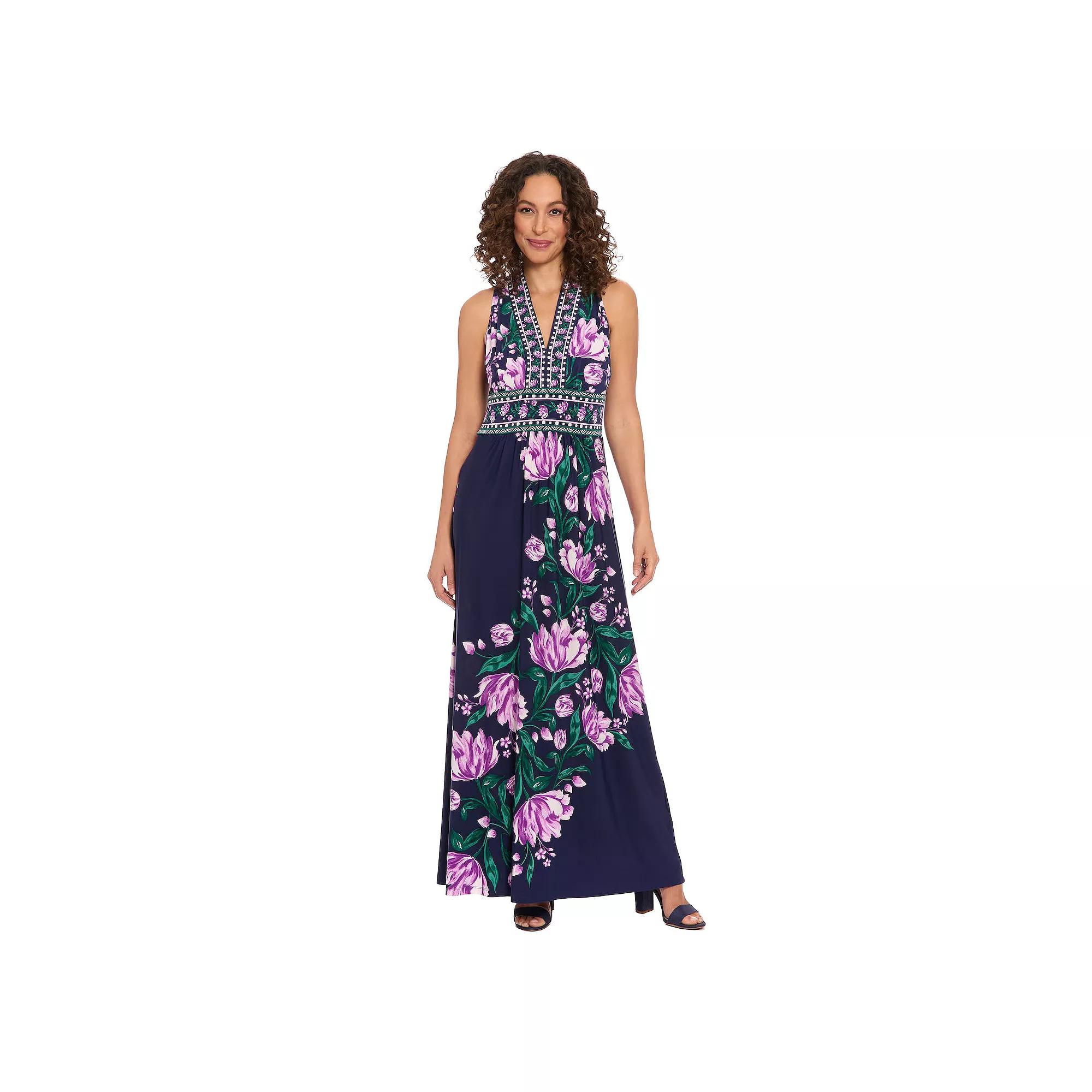 Walk into the room in style wearing this petite London Times sleeveless V-neck maxi dress. Click on this WOMEN'S GUIDE to find the perfect fit and more!Walk into the room in style wearing this petite London Times sleeveless V-neck maxi dress. Click on this WOMEN'S GUIDE to find the perfect fit and more!FEATURES V-neck Sleeveless Straight hem Jersey construction A-line silhouette Pullover stylingFIT & SIZING Fitted at top, a line skirt 52 3/4-in. length from shoulder to hem Maxi length hits at the ankleFABRIC & CARE Polyester, spandex Machine wash Imported Size: 6 Petite. Color: Navy Purple. Gender: female. Age Group: adult.