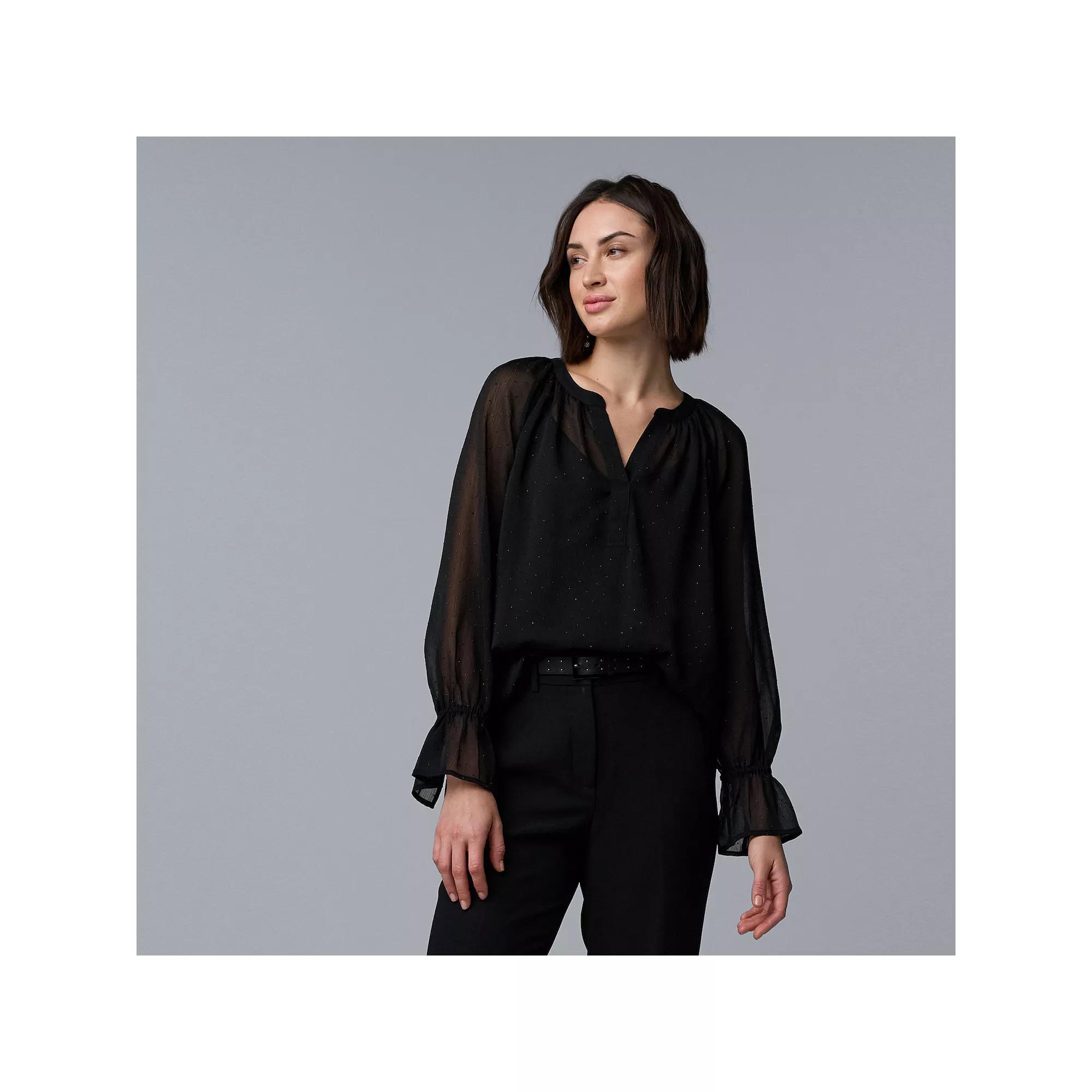 Elevate your wardrobe with this charming blouse featuring a lovely shirred neck and a playful faux tie elastic cuff that adds the perfect touch of elegance. Crafted with a glimmering metallic yarn chiffon, this Simply Vera Vera Wang piece is sure to become your go-to for those moments when you want to look effortlessly chic while feeling completely comfortable. Click on this WOMEN'S GUIDE to find the perfect fit and more! - https://www.kohls.com/feature/womens-fit-guide.jsp. FEATURES: Metallic yarn chiffon adds a touch of elegance, Faux tie elastic cuff for a stylish fit, Cami lining for added comfort, Rhinestone chiffon detail enhances visual appeal. FIT & SIZE: Regular fit, 25 1/2-in. length from shoulder to hem, Rounded hemline. MATERIAL & CARE: Polyester, Partially lined, Hand wash & machine wash. DETAILS: Y-neck, Long, raglan ruggle sleeves, Elastic cuffs, Imported. RESPONSIBLE Tested for harmful substances, STANDARD 100 by OEKO-TEX® CERTIFIED, Certification No. SE020 194919, Testing Institute: Testex AG: Swiss Textile Testing Institute, www.oeko-tex.com/standard100 - https://www.oeko-tex.com/en/our-standards/oeko-tex-standard-100. Size: S Petite. Color: Black. Gender: female. Age Group: adult. Material: OTHER MATERIAL.