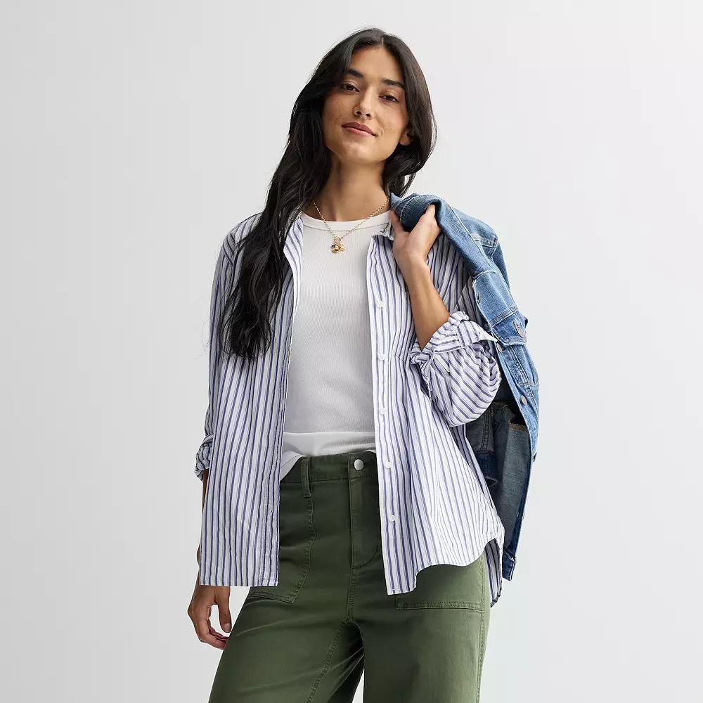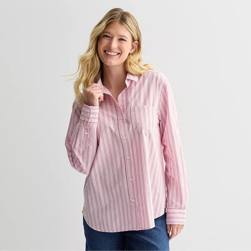 Elevate your wardrobe with this stylish button-up from Sonoma Goods For Life. Perfect for casual outings or laid-back workdays, this versatile shirt can be effortlessly layered under your favorite jacket or paired with jeans for a chic, everyday look. Click on this WOMEN'S GUIDE to find the perfect fit and more! - https://www.kohls.com/feature/womens-fit-guide.jsp. FEATURES: Collared neckline, Long sleeves, Roll-tab sleeves, Button cuffs, Button closure, 1 chest pocket, Shirttail hem. FIT & SIZING: 27 1/2-in. length from shoulder to hem. FABRIC & CARE: Cotton, tencel, Vital white: cotton, Machine wash, Imported. Size: M Petite. Color: Green White Stripe. Gender: female. Age Group: adult.