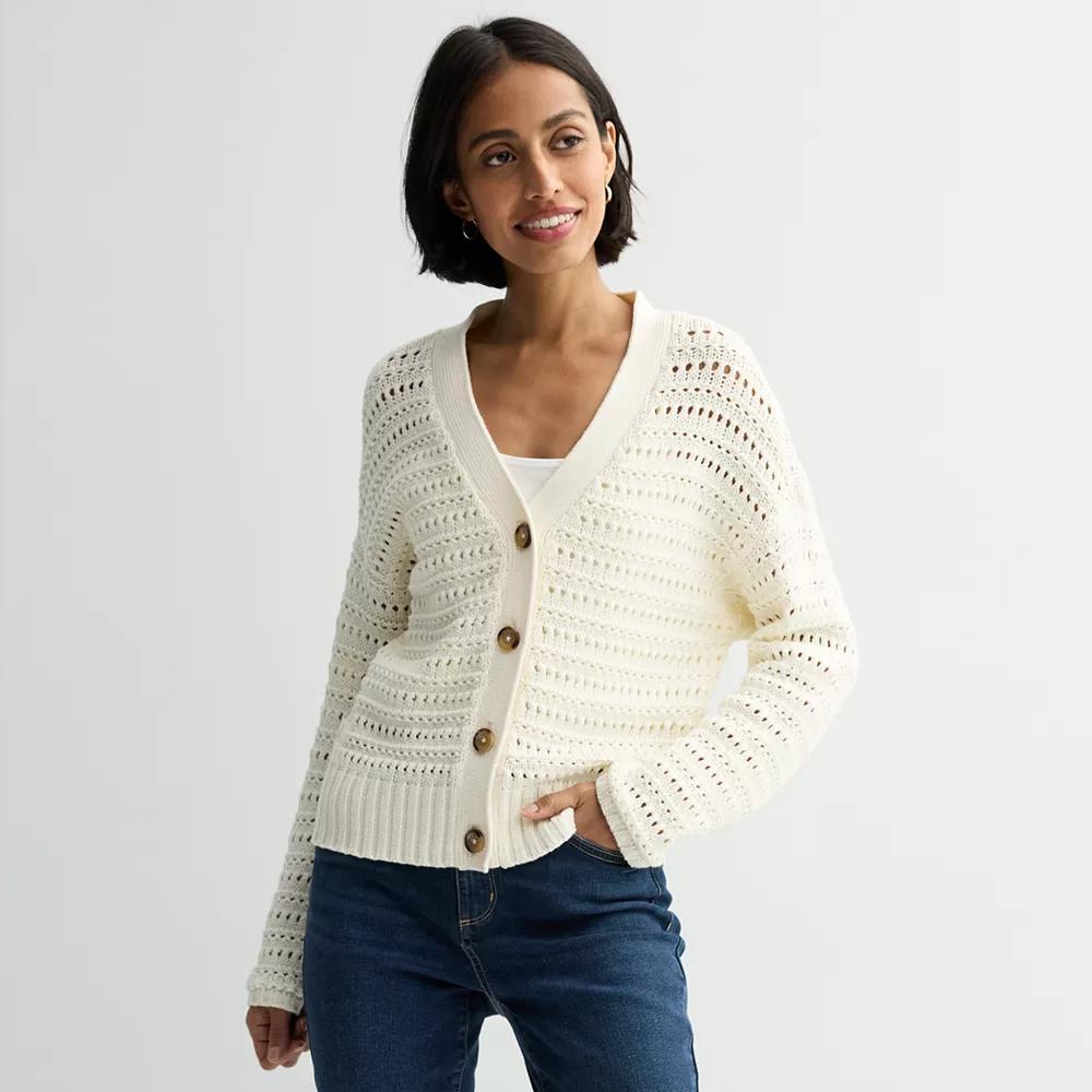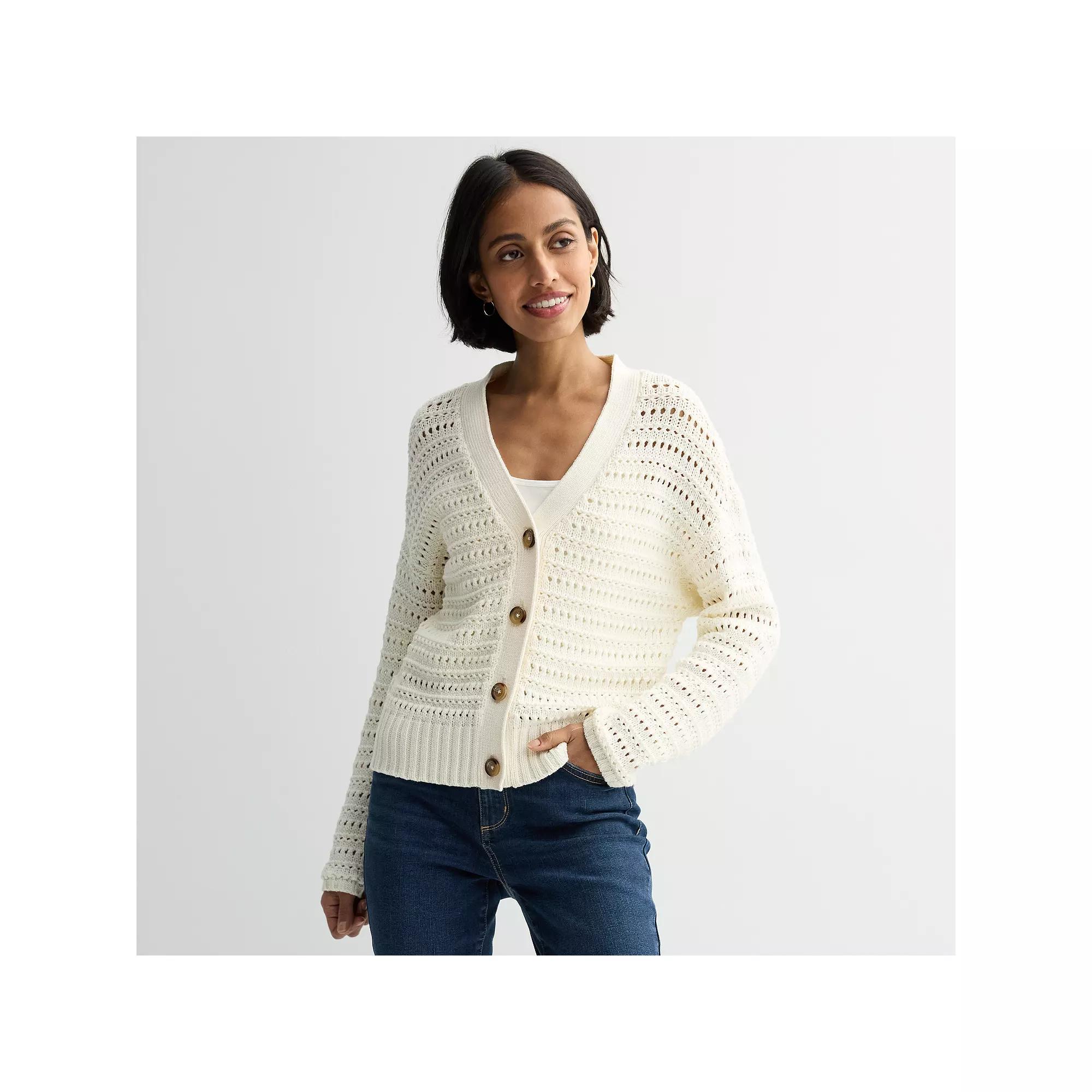 Spruce up your wardrobe with this women's open knit cardigan from Sonoma Goods For Life. Click on this WOMEN'S GUIDE to find the perfect fit and more!Spruce up your wardrobe with this women's open knit cardigan from Sonoma Goods For Life. Click on this WOMEN'S GUIDE to find the perfect fit and more!FEATURES V-neck Long sleeves with ribbed cuffs 4-button front Open stitch construction UnlinedFIT & SIZING 21.75-in. length from shoulder to hemFABRIC & CARE Cotton, acrylic Machine wash delicate ImportedRESPONSIBLE Supports more sustainable cotton farming Size: Large. Color: Ivory Silk. Gender: female. Age Group: adult.