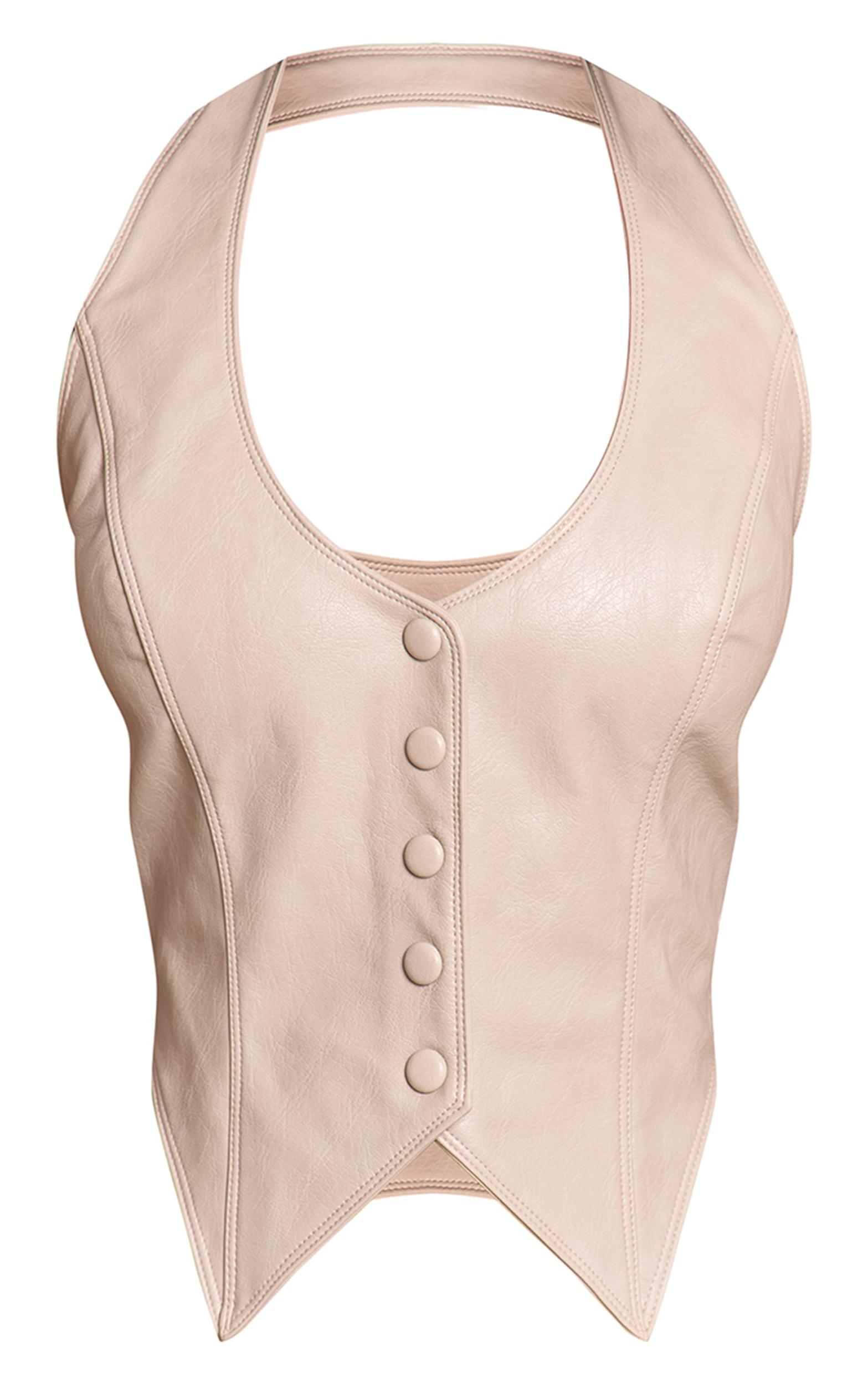 Keep it edgy with the petite stone button up faux leather halterneck top. Made from faux leather in a versatile stone shade, this halterneck features a button-up front for a structured fit. Style with wide leg pants and strappy heels for a contemporary outfit.Length approx 45.5cm/18inch (Based on sample size US 2)Model wears size UK 6/ EU 34/ AUS 6/ US 2Model Height - 5ft 2inchp]:!mb-4inch>Brand: PrettyLittleThingCategory: TopsProduct type: Cami TopColor: StoneMaterial: Faux LeatherOccasion: Day