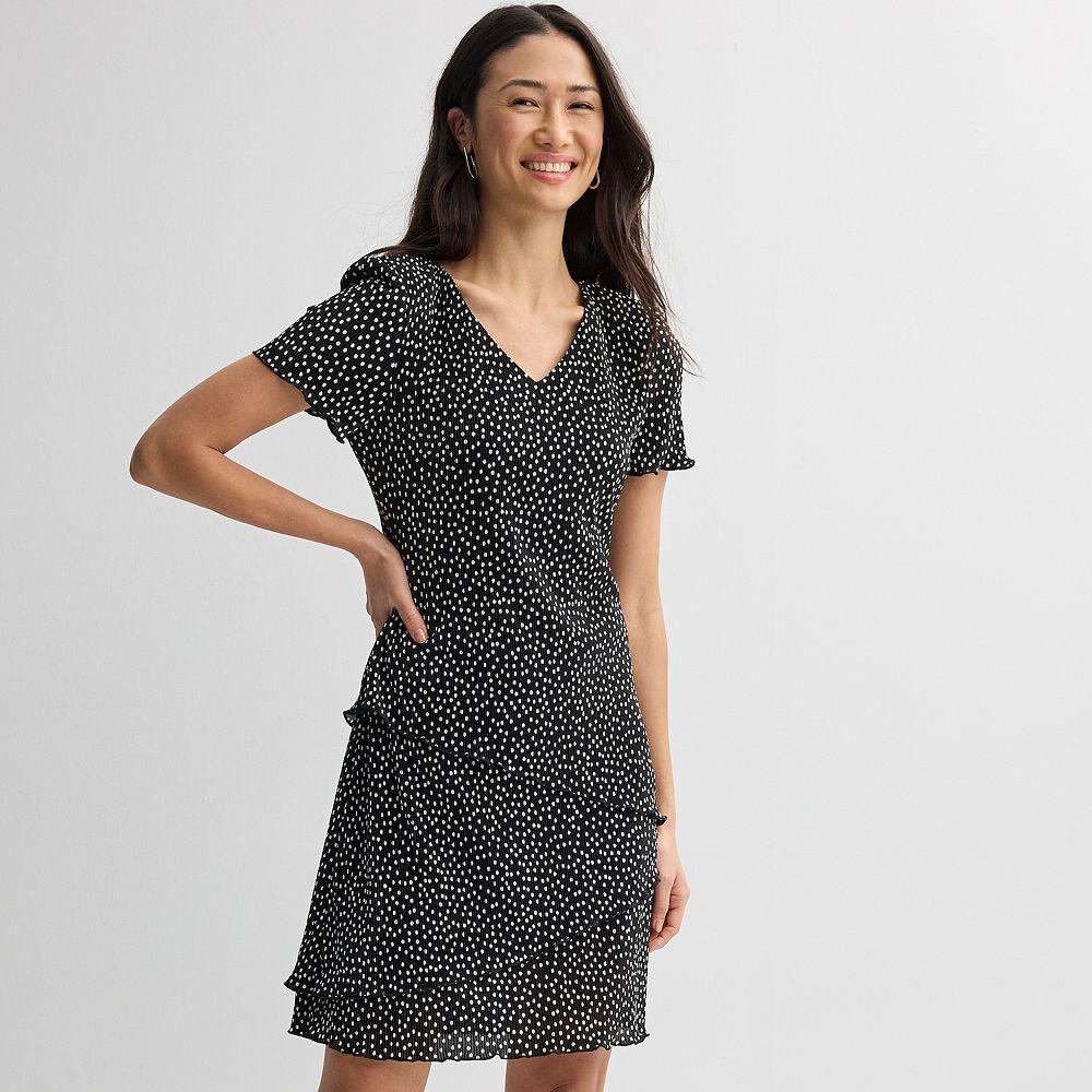 This tiered petite mini dress by Studio Connection is perfect for any occasion. Click on this WOMENS GUIDE to find the perfect fit and more!This tiered petite mini dress by Studio Connection is perfect for any occasion. Click on this WOMENS GUIDE to find the perfect fit and more!FEATURES Straight hem No closure - pullover styling Set-in short sleeves V-neckFIT & SIZING Regular petite fit 38-in. length from shoulder to hem Mini length, hits above kneeFABRIC & CARE Polyester Hand wash cold, lay flat to dry Imported Size: 10 Petite. Color: Black Ditsy. Gender: female. Age Group: adult.