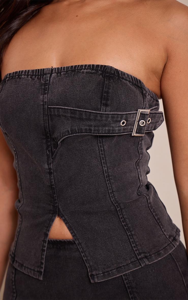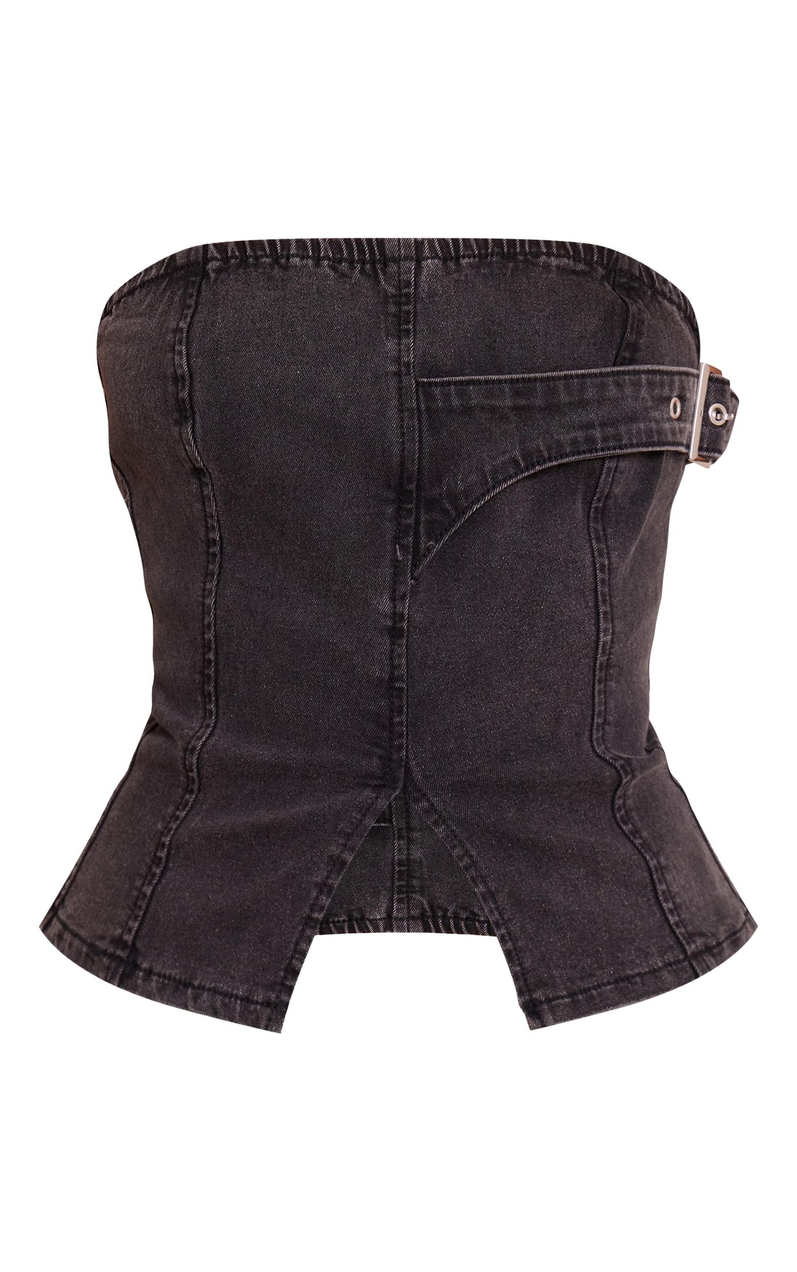 Own the evening with a denim refresh that elevates your going-out rotation. The petite washed black denim longline bandeau corset redefines after-dark wear, featuring a structured bandeau neckline and a form-flattering longline cut that extends with an on-trend notched front hem. Its distinctive corset-inspired paneling and a statement buckle detail at the side introduce an edge to the washed black finish. Pair this standout top with the coordinating denim mini skirt for a cohesive look, or choose sleek tailored pants for a more elevated ensemble. Complete your night-out aesthetic with towering black heels and a chic black bag, ensuring you make a confident statement that turns heads long after sundown.Length approx 29cm/11.5inch (Based on sample size US 2)Model wears size UK 6/ EU 34/ AUS 6/ US 2Model Height - 5ft 2inchp]:!mb-4inch>Category: DenimProduct type: Denim CorsetColor: Washed BlackMaterial: Rigid DenimDesign: PlainNeckline: BandeauSleeves: BandeauOccasion: Evening