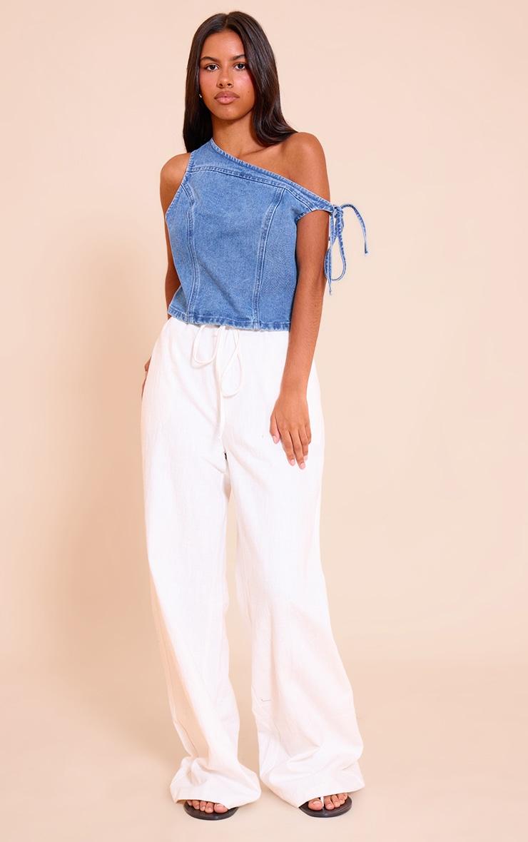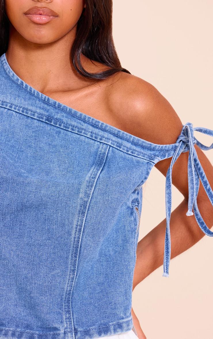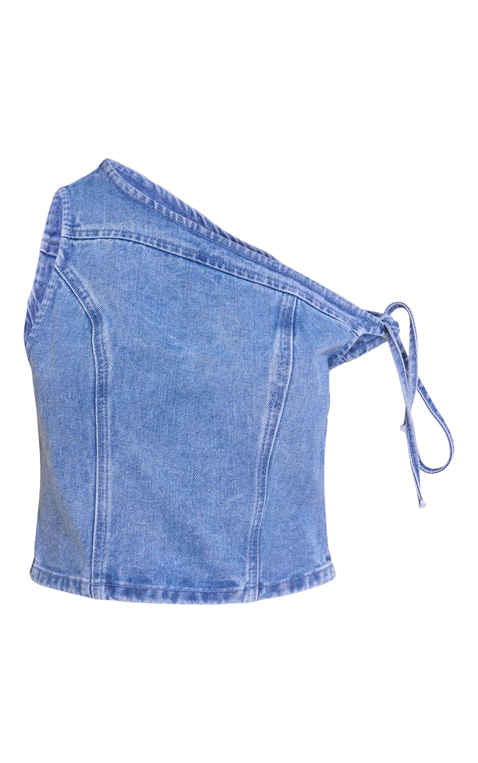 Denim steps out for the evening agenda with this artful shape. The Petite Washed Blue Asymmetric Denim Crop Top cuts a confident line, defined by its single shoulder silhouette completed with subtle tie detailing on the bare side. This washed blue crop provides a focused form perfect for after dark. Pair it with sharp black tailored pants or a high-waisted skirt to anchor a knowing evening aesthetic.Length approx 45.5cm/18inch (Based on sample size US 2)Model wears size UK 6/ EU 34/ AUS 6/ US 2Model Height - 5ft 3inchp]:!mb-4inch>Brand: PrettyLittleThingCategory: DenimProduct type: Denim TopColor: Washed BlueMaterial: Stretch DenimDesign: PlainNeckline: AsymmetricSleeves: ShortOccasion: Evening