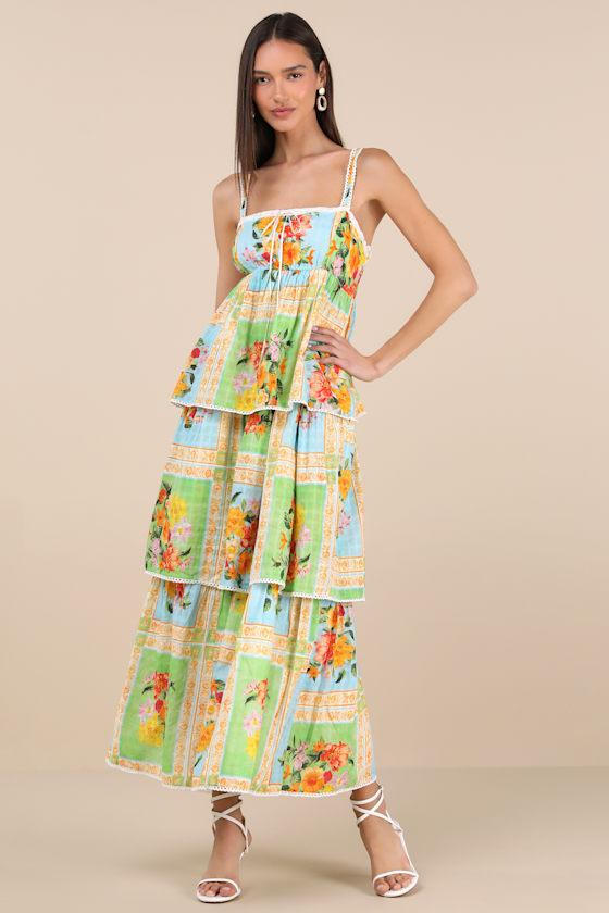 Bedecked with the most summery of prints, this multicolored floral dress by Show Me Your Mumu will help you skip through the season in adorable style. Lightweight woven cotton shapes adjustable straps that support a babydoll-style bodice (with a dainty tying detail) and tiered A-line skirt that finishes at an ankle-grazing hem. Crochet lace trim throughout lends an extra darling touch. Smocking at back and hidden side zipper.