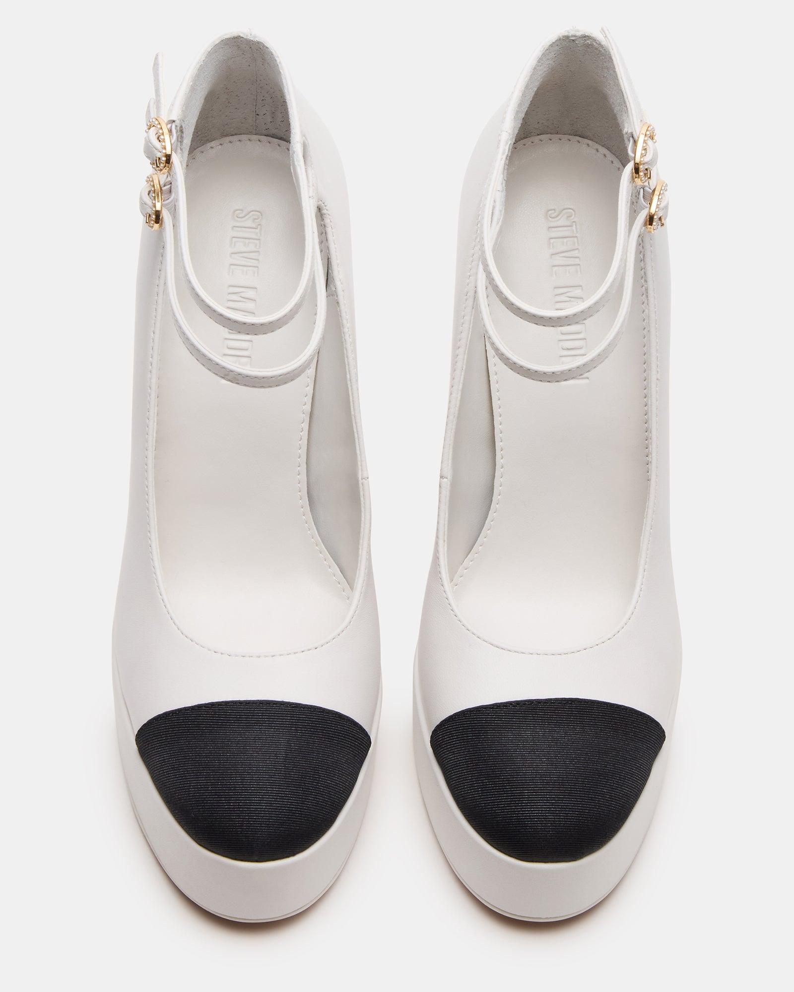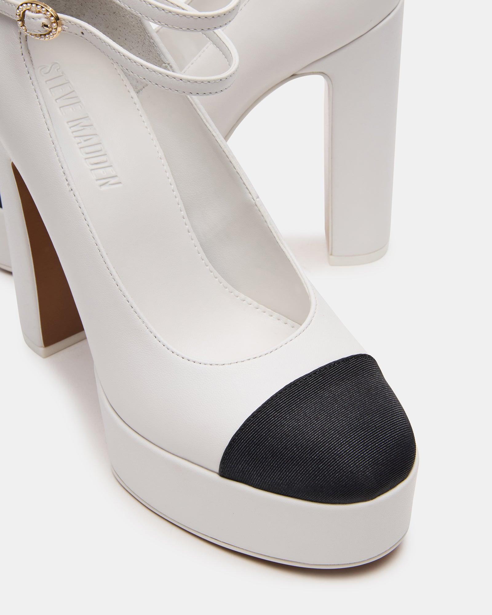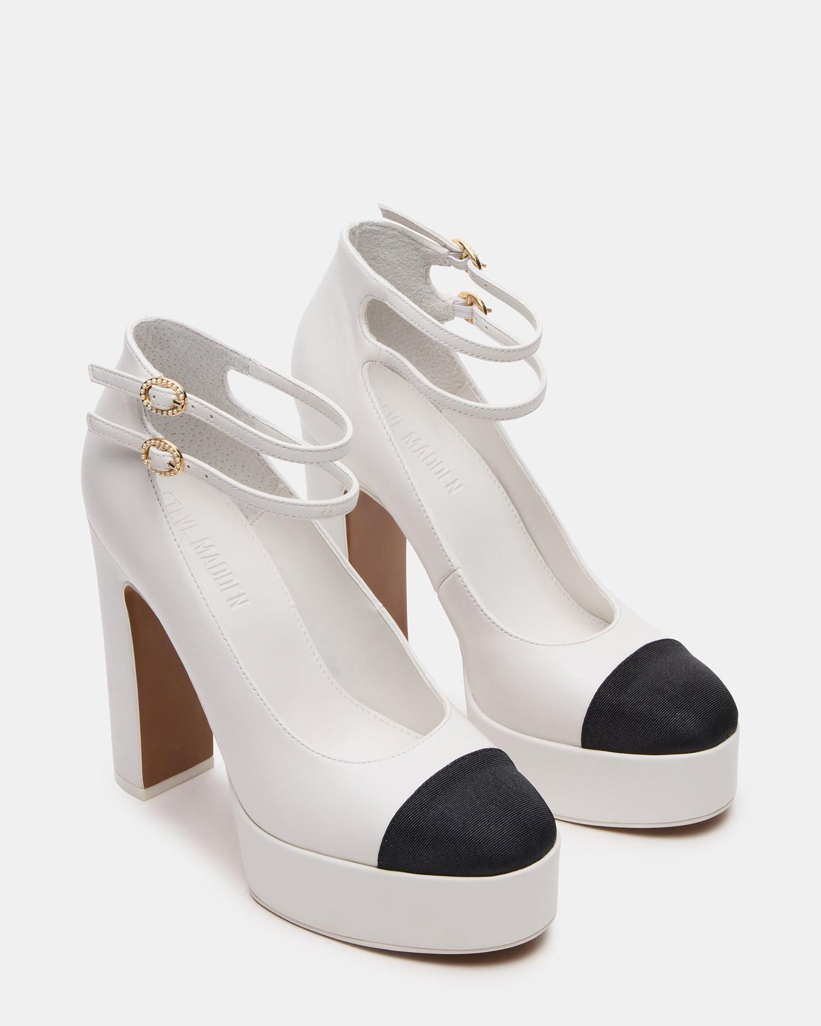 Elevate your style with PEYTON, featuring a sophisticated platform silhouette with a sturdy block heel for all-day stability. The distinctive toe cap design adds architectural interest, while the secure ankle strap ensures a confident fit. This versatile heel combines fashion-forward design with practical wearability for any occasion. 5 inch heel height 1.25 inch platform Leather and textile upper material Synthetic lining Synthetic sock Synthetic sole Imported