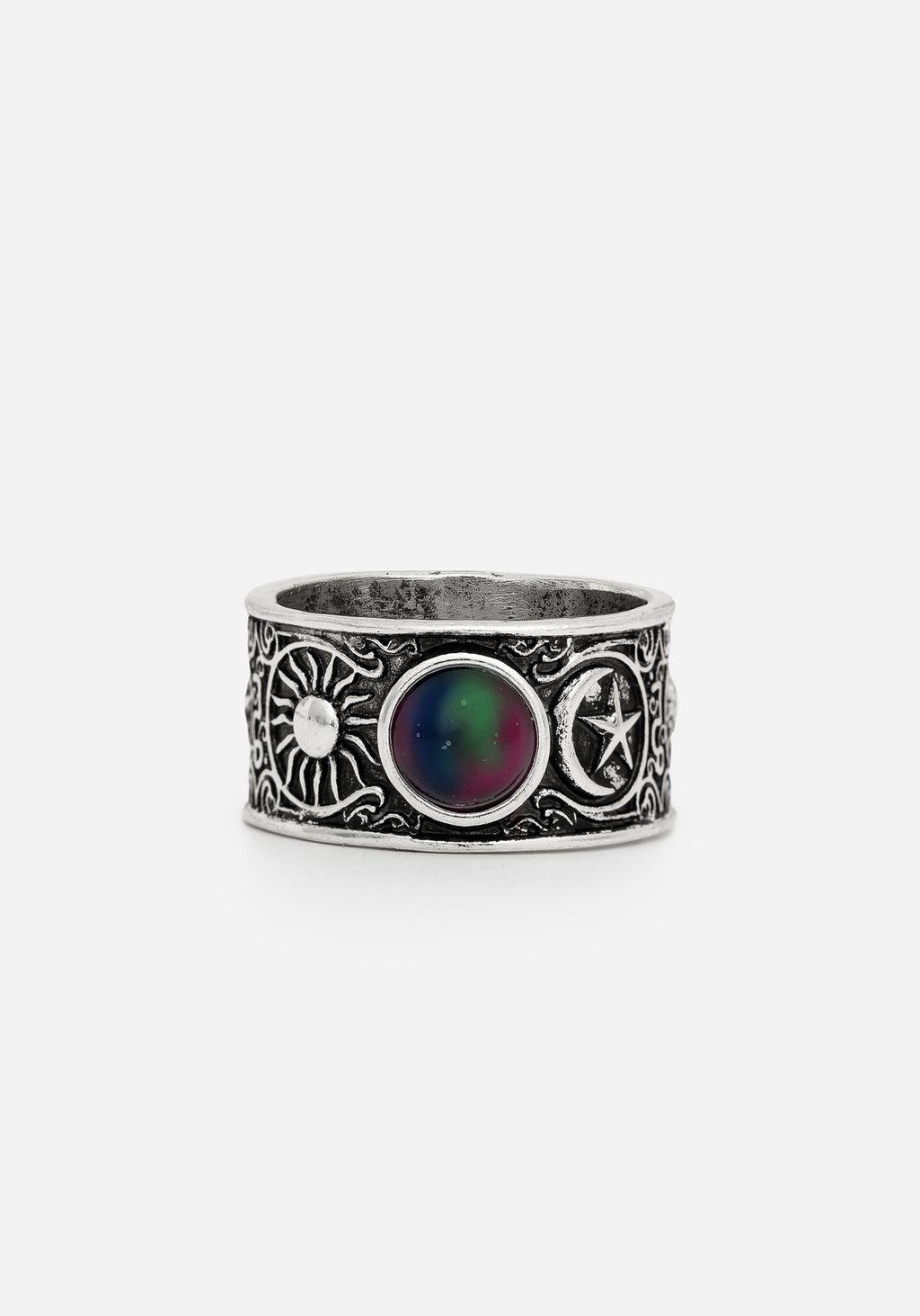 A silver-plated celestial ring embossed with night sky motifs & finished with a colour-changing mood stone. - COLOUR: Antique Silver - COMPOSITION: Real Silver Plate - GEMSTONE: Mood Stone - BAND WIDTH: 1cm