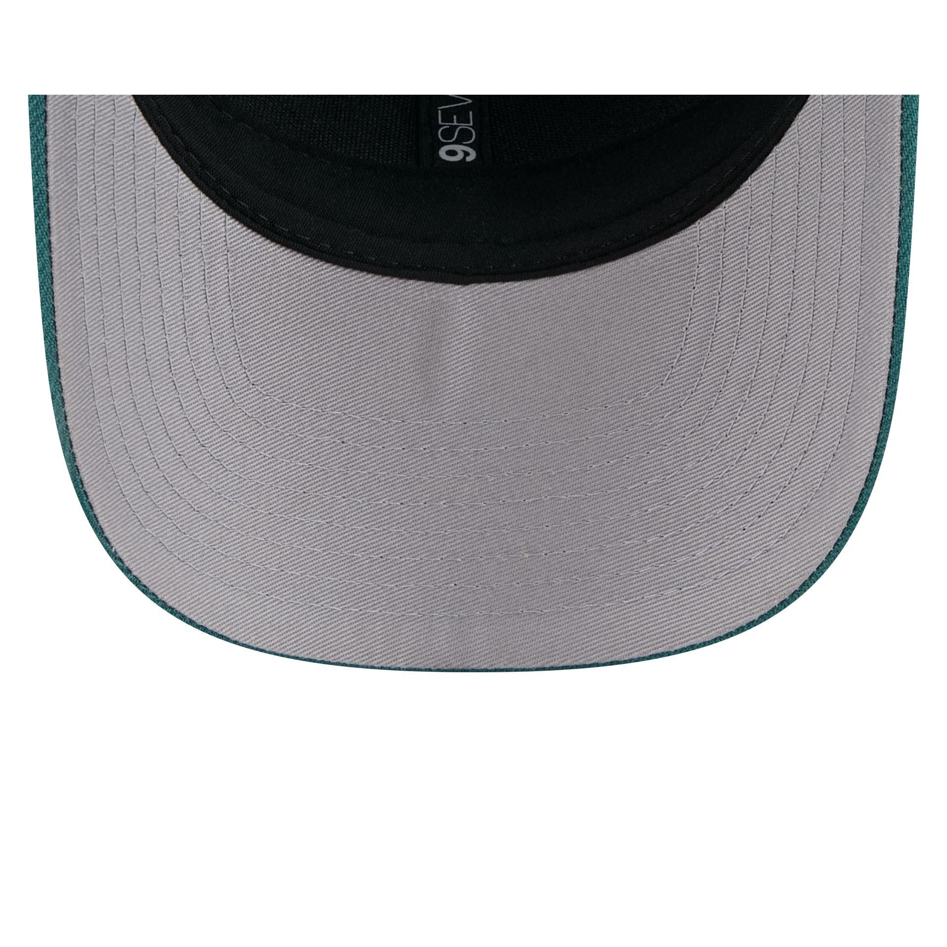The Philadelphia Eagles Tee Time 9SEVENTY Stretch-Snap Trucker features an embroidered white Eagles logo at the front panels with a removeable New Era golf pin to the left. Additional details include a snapback closure at a performance mesh rear and a gray undervisor.