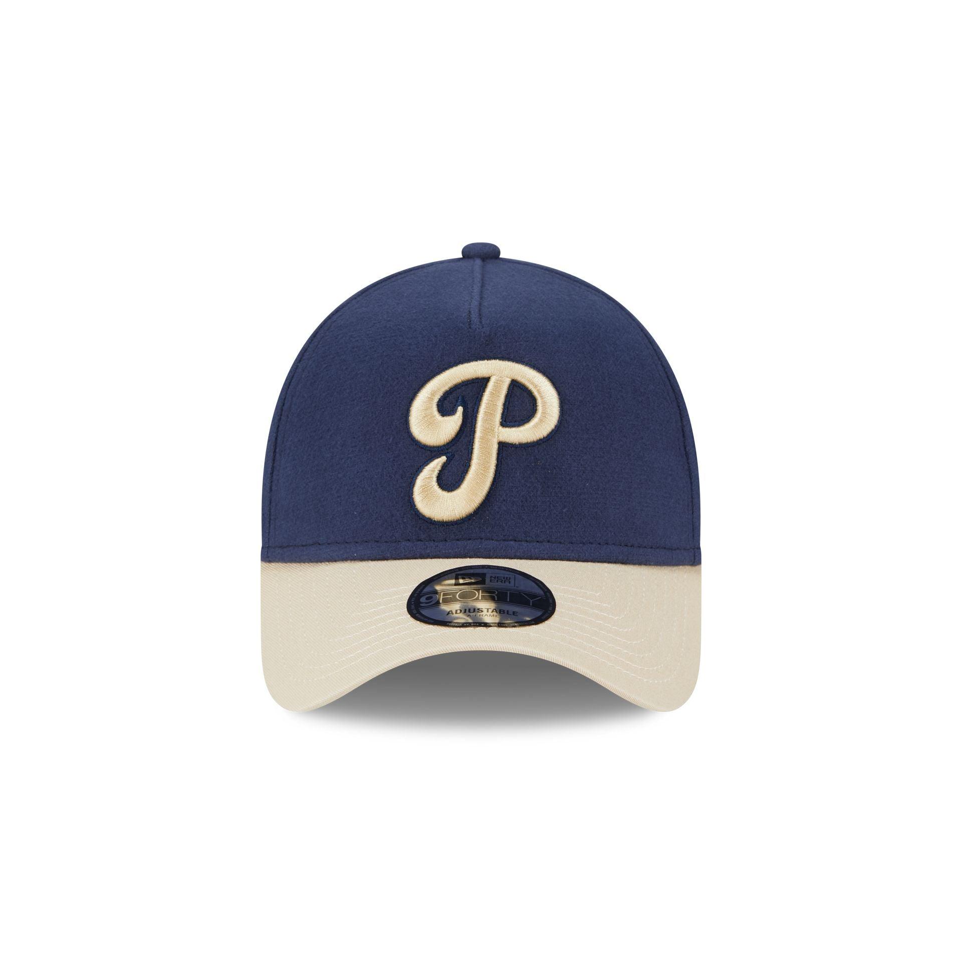 The Philadelphia Phillies Moleskin Crown Navy 9FORTY A-Frame Snapback features an embroidered Phillies Cooperstown logo at the front panels with an adjustable snapback closure at the rear and a tan undervisor.