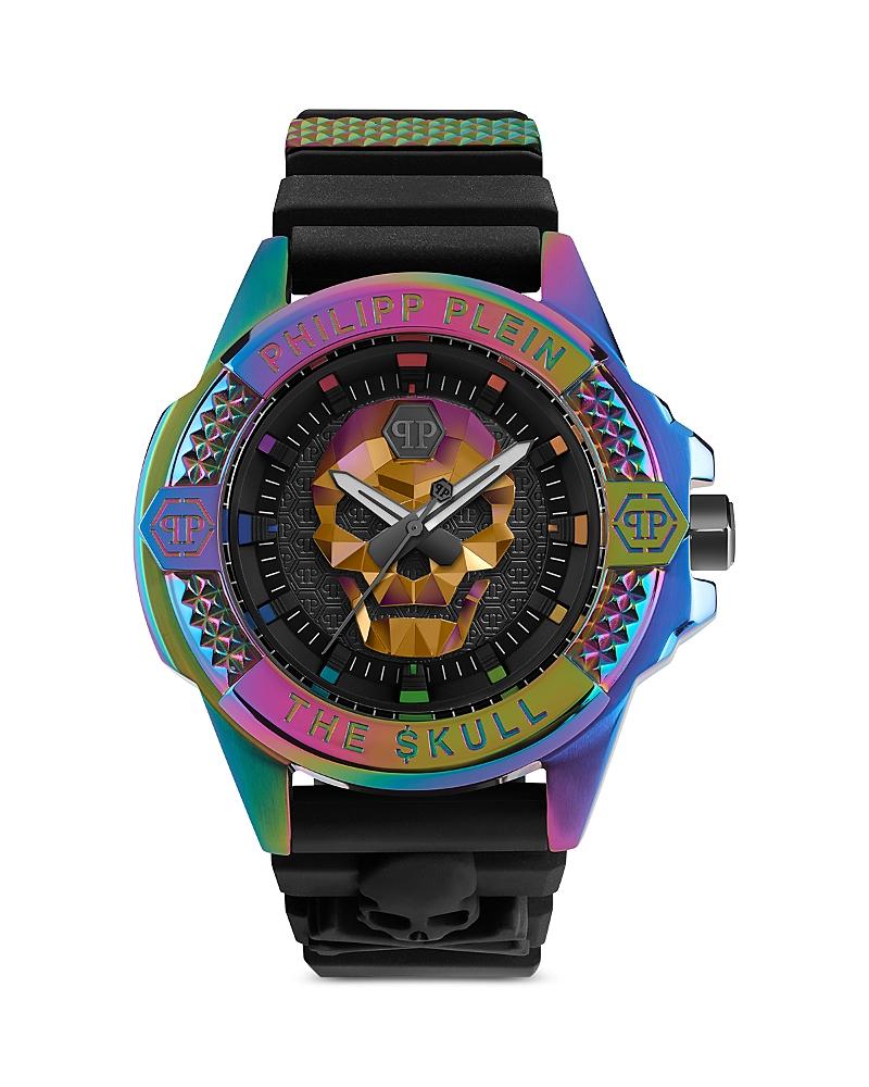 A geometric skull combines the brands signature motifs on the dial of this statement-making watch highlighted by an iridescent finish. 44mm case; 22mm band width Quartz movement Mineral crystal face Stainless steel/iridescent plate/silicone Imported