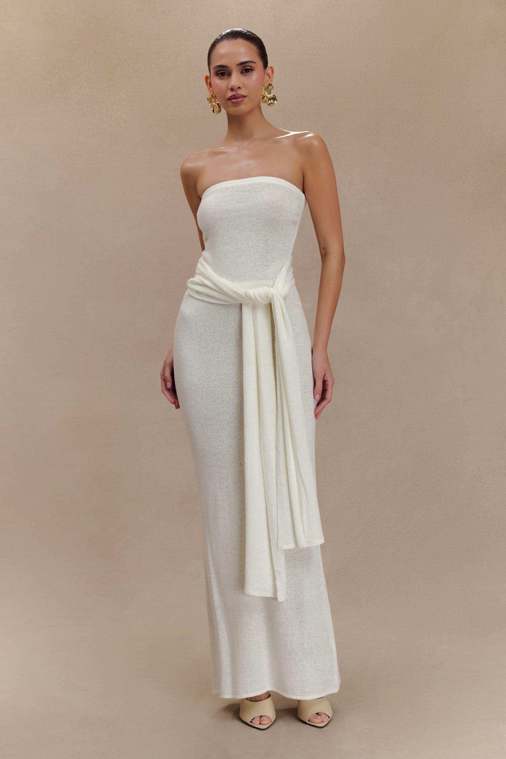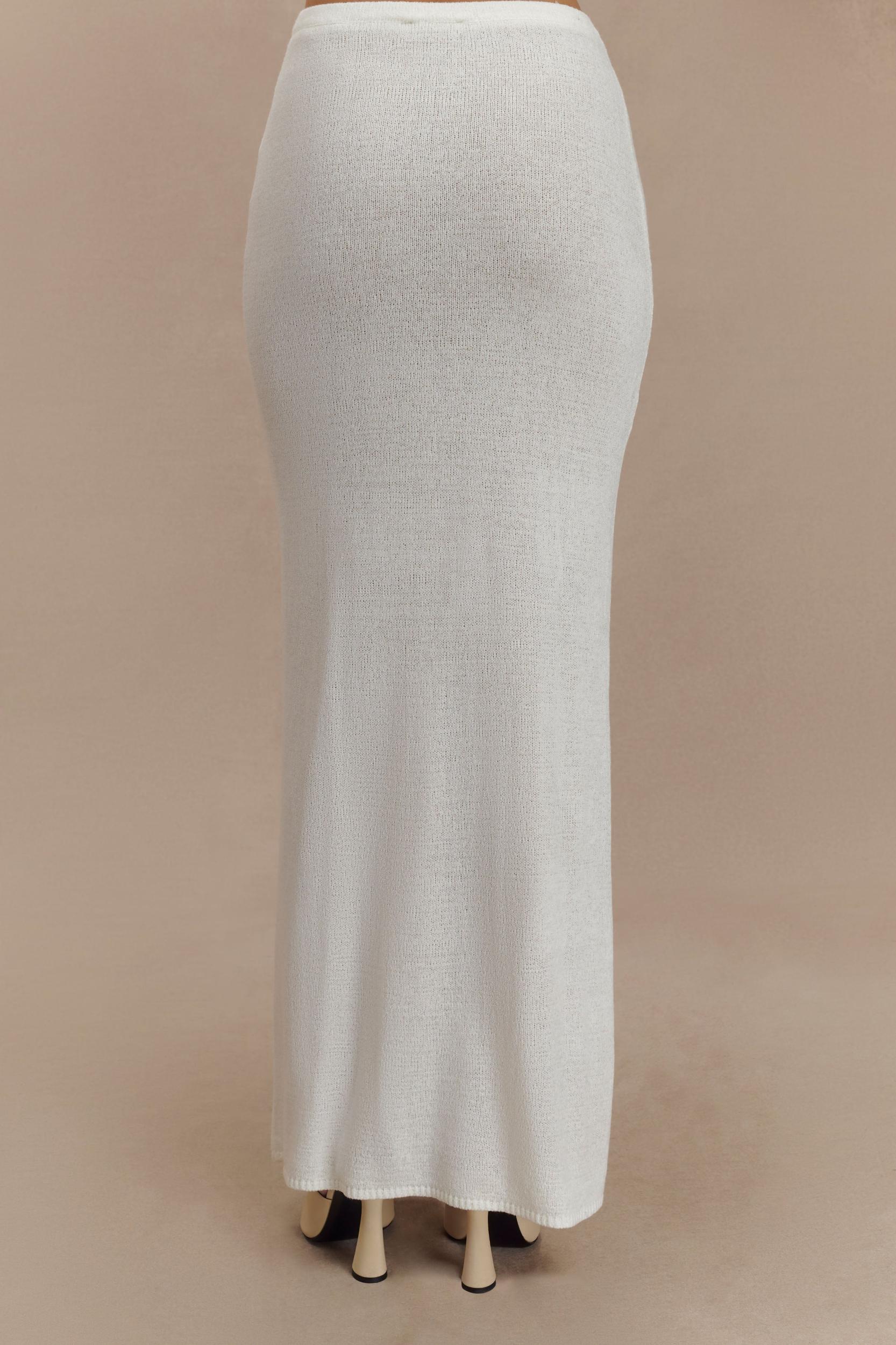 Flow freely. Introducing the PHOEBE Knit Maxi Skirt, a stunning piece that effortlessly combines comfort and sophistication. This high-waisted skirt features a flattering fishtail hem shape that gracefully drapes around your silhouette, creating an elegant, flowing effect. The elastic waist ensures a comfortable and secure fit, while the sheer knit fabrication adds a touch of allure. Lined with soft mesh for added coverage, this skirt is perfect for both casual outings and dressier occasions. Pair it with the Phoebe Strapless Tie Knit Top for a chic, coordinated look that showcases your style.