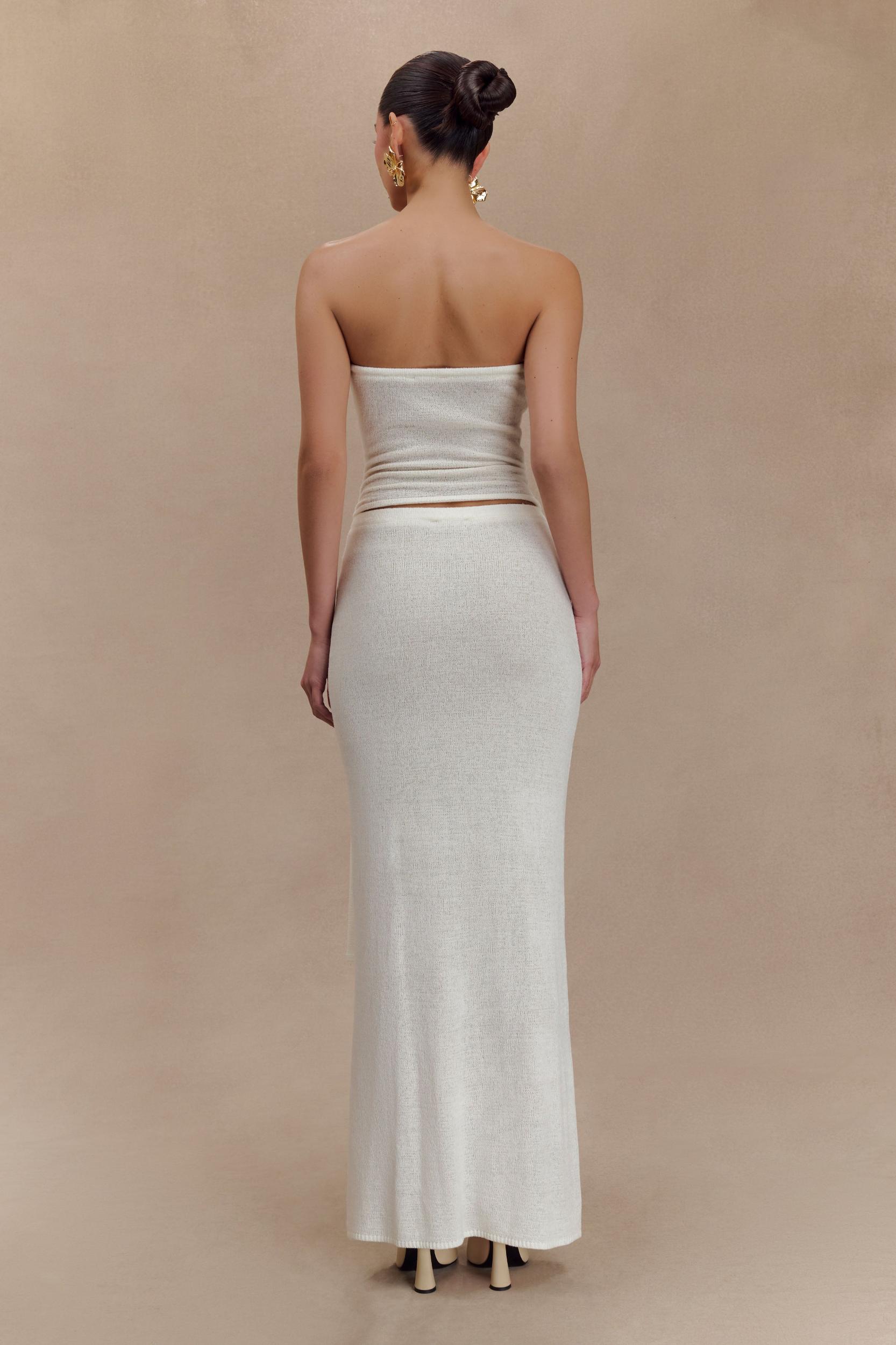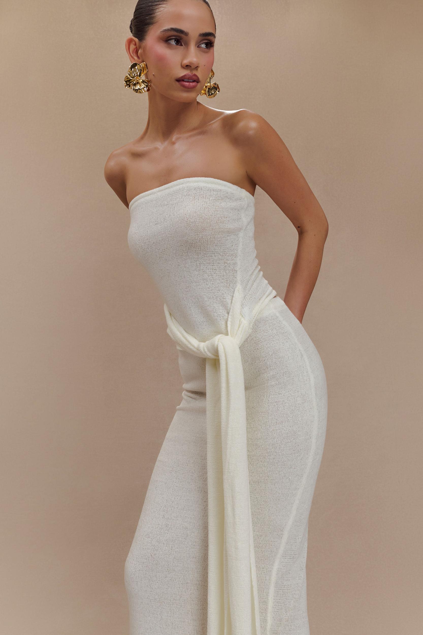 A twist of style. Elevate your style with the PHOEBE Strapless Tie Knit Top, a perfect blend of modern elegance and playful sophistication. This top features a comfortable strapless design with an elastic bust, ensuring a secure fit that flatters your figure. The eye-catching sash tie detail at the hip adds a chic focal point while enhancing your silhouette. Crafted with soft knit fabric and mesh lining, this top offers both comfort and breathability, making it ideal for any occasion. Pair it with the Phoebe Knit Maxi Skirt for a coordinated ensemble that seamlessly combines effortless style with contemporary charm.