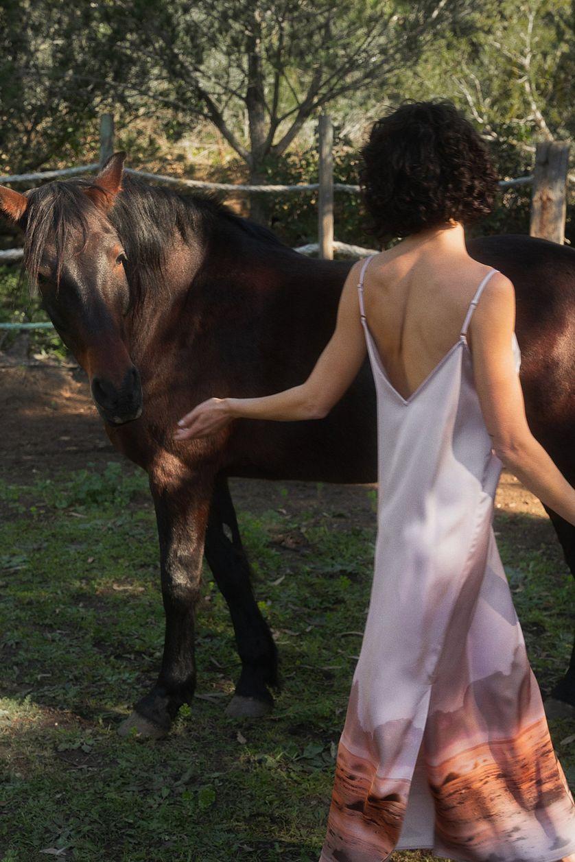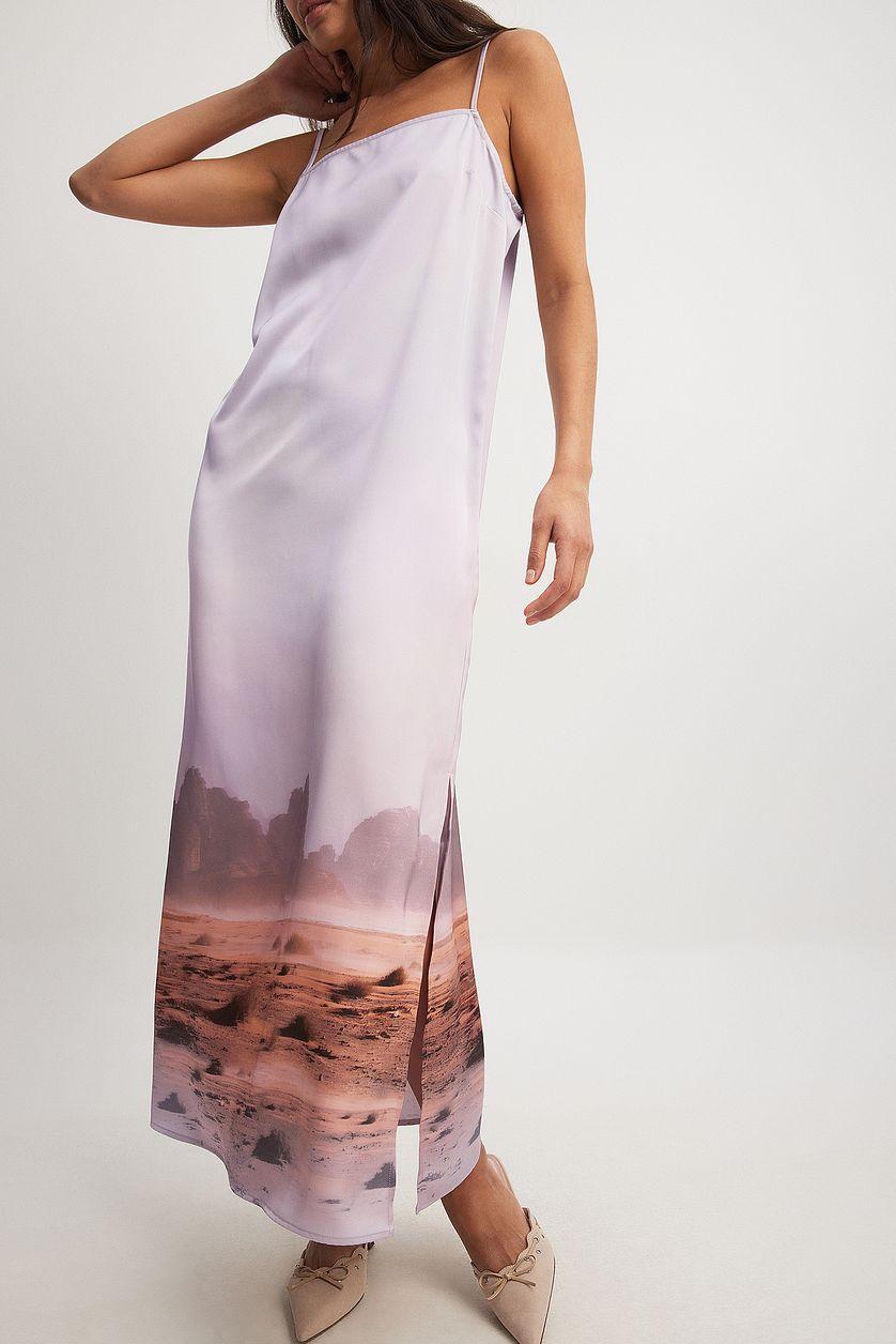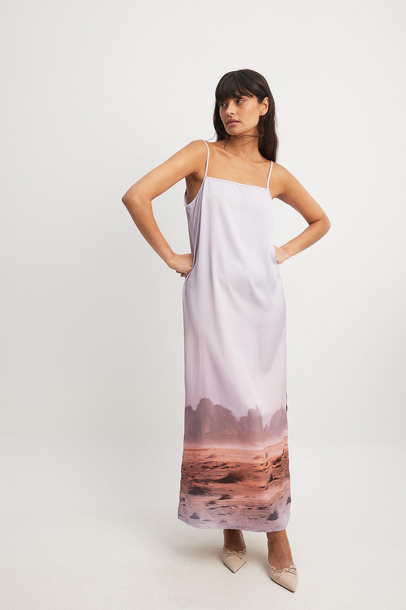 This slip dress features a loose fit. It has a non-stretchy material and thin, adjustable shoulder straps. The slip dress has side slits and a deep back.