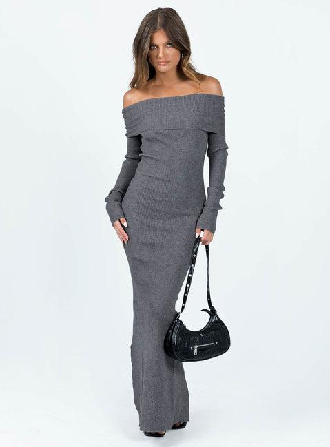 Long sleeve maxi dress Slim fitting 48% viscose 28% polyester 24% elastane Length of size US 4 / AU 8 bust to hem: 136cm / 53.4in Elise is wearing a size US 2 / AU 6 Ribbed knit material Off-the-shoulder design Folded neckline Leg slit Good stretch Unlined
