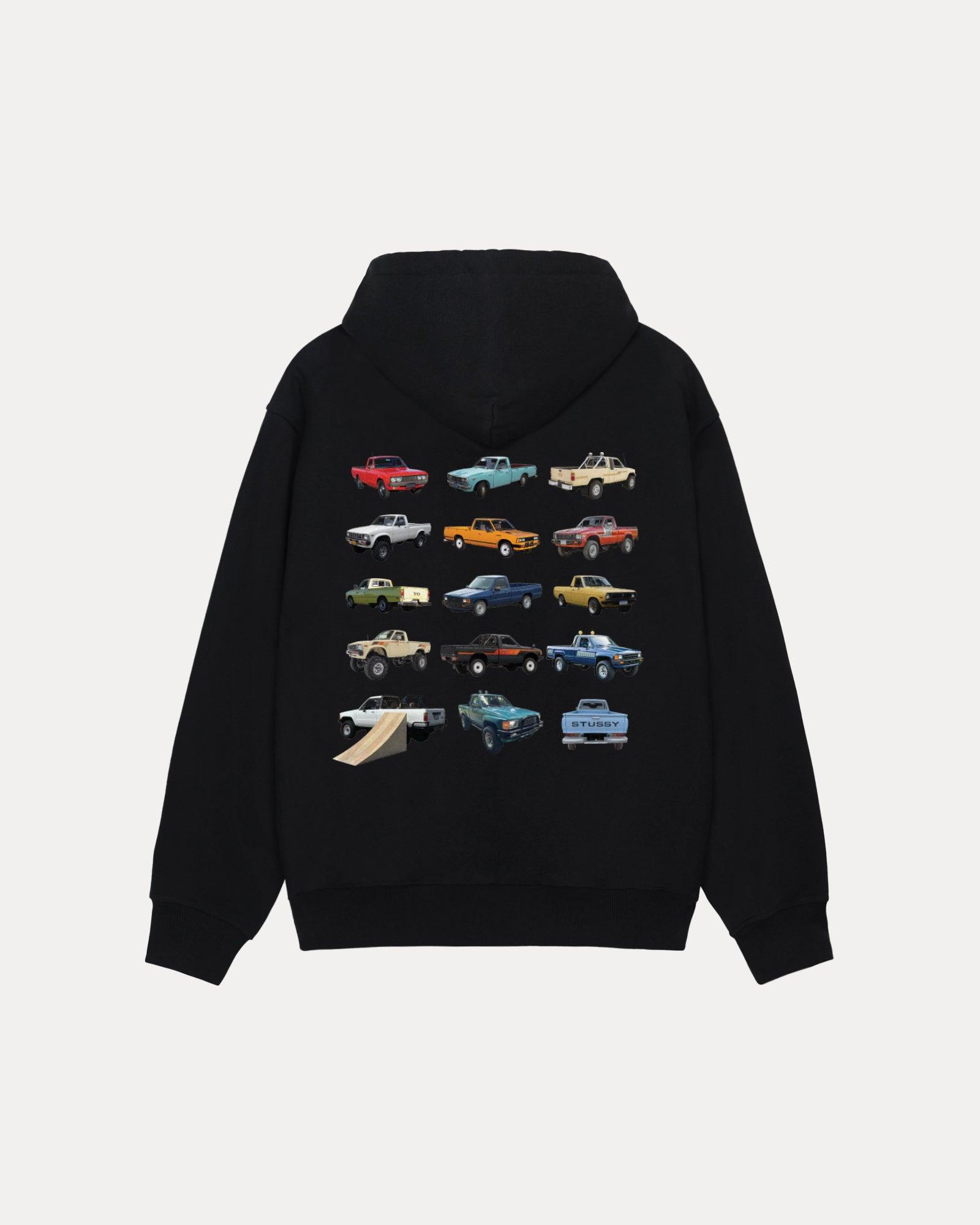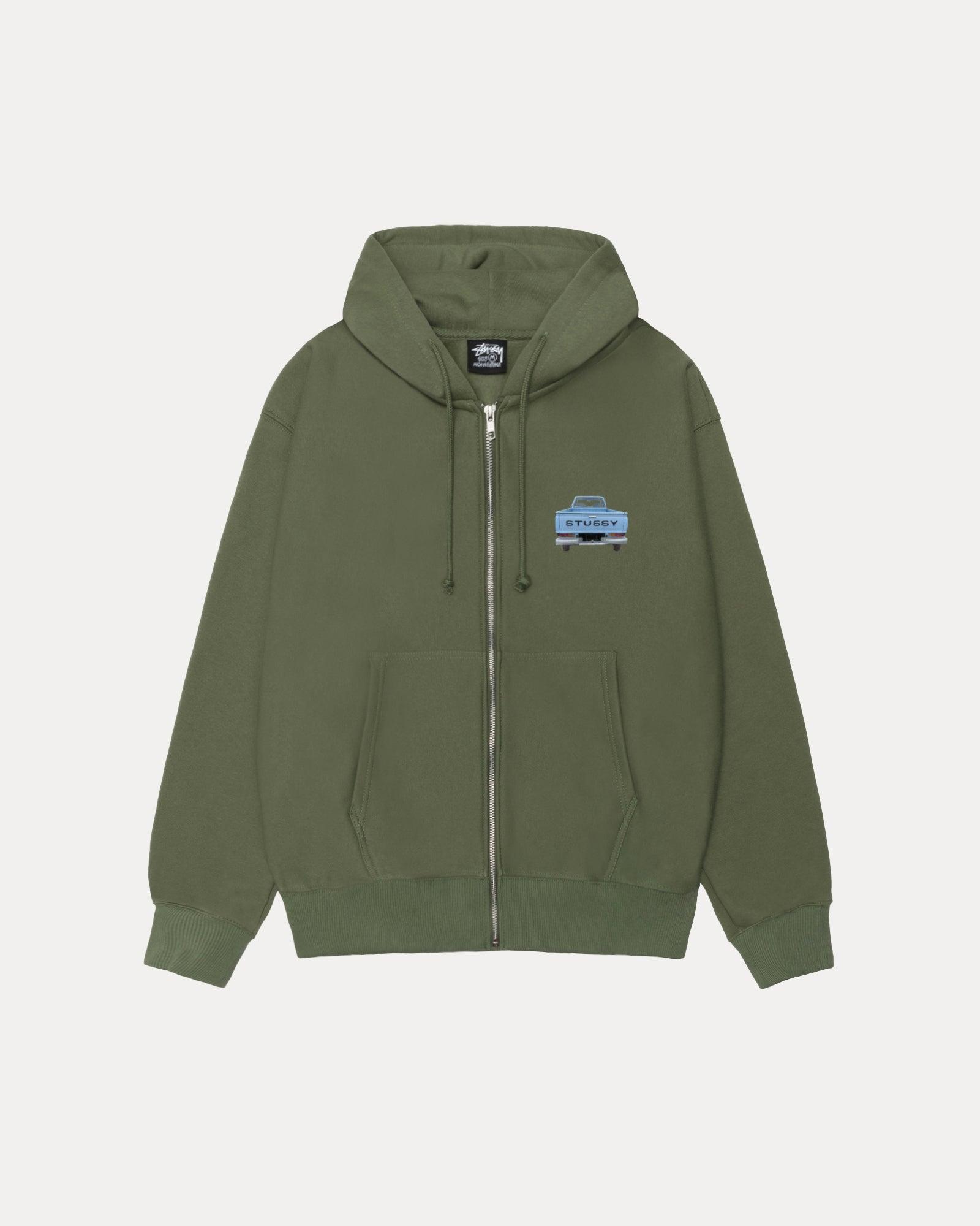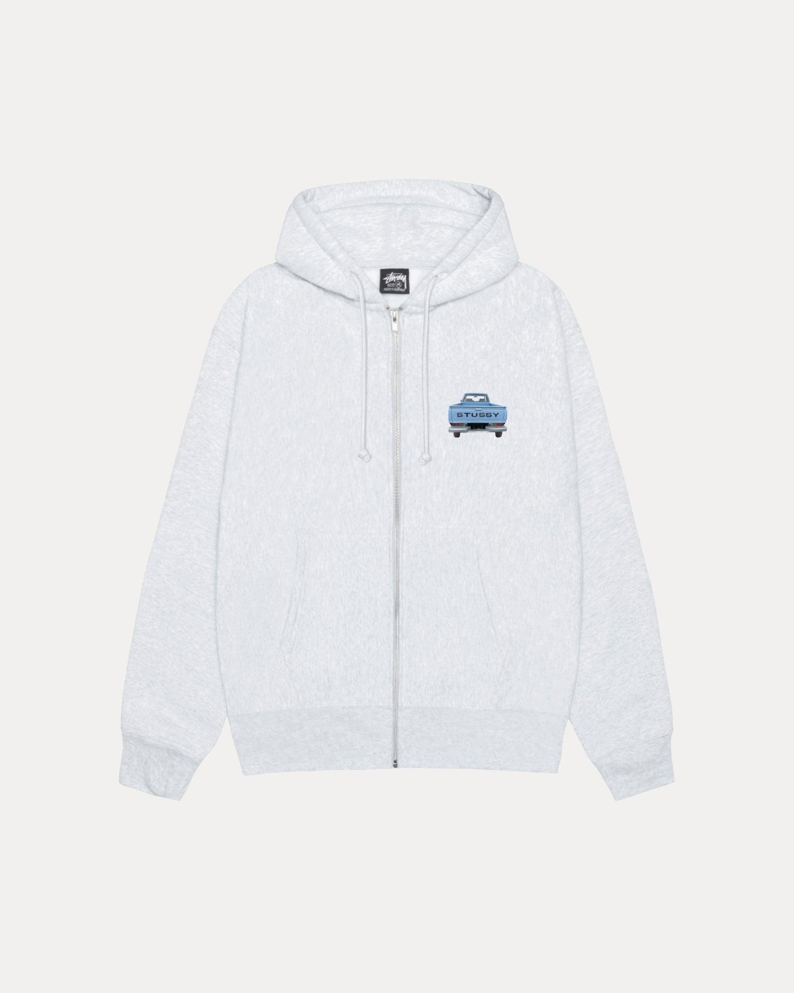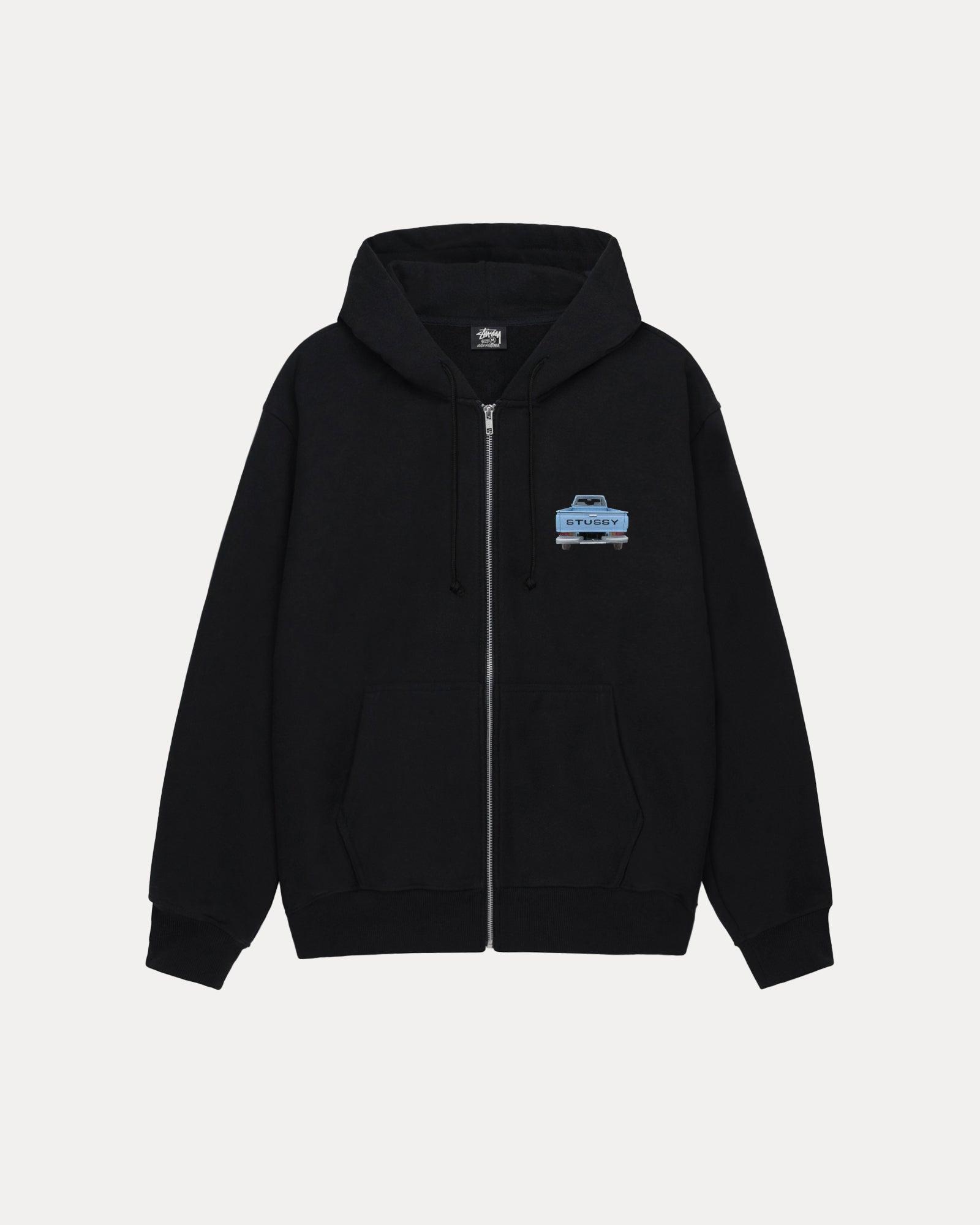 Relaxed fit zip-front fleece hoodie in a heavyweight 430gsm cotton blend. Screenprinted graphics at left chest and across back. - Longsleeve - Round woven drawcord in hood - #5 YKK zip front closure - Ribbed cuffs and hem - Kangaroo pocket - Relaxed fit - Unisex - Material: 75% cotton / 25% polyester - Imported