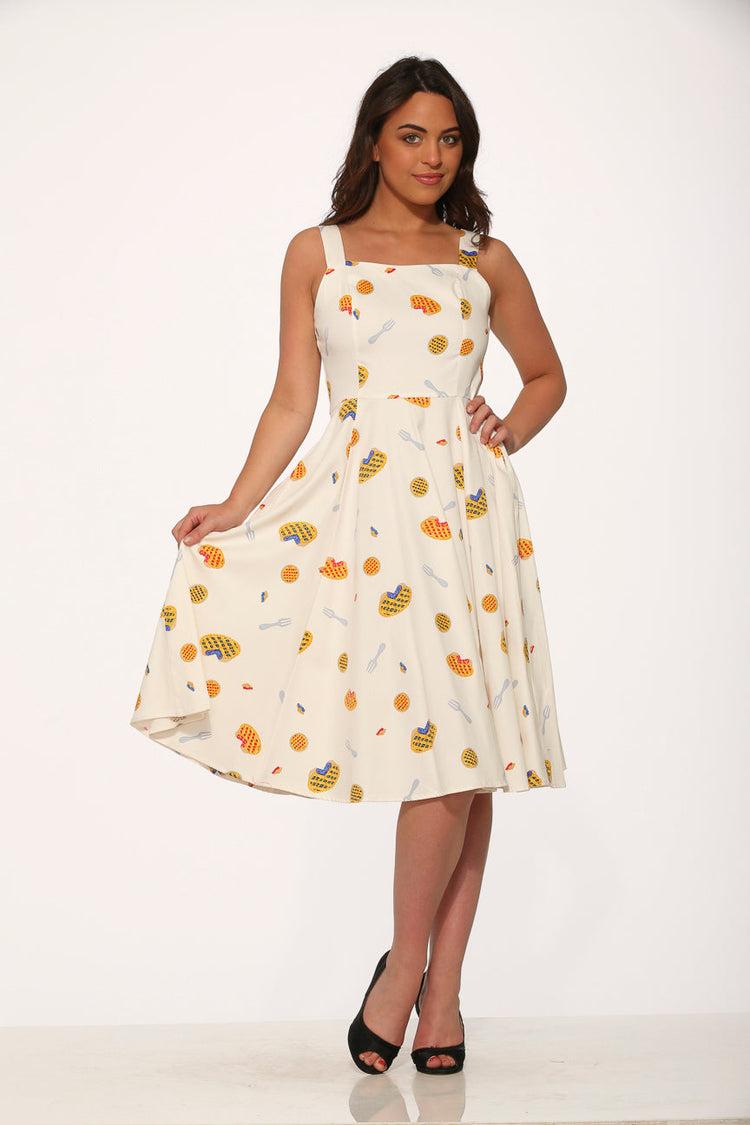 Serve up a slice of vintage sweetness in the Orchid Bloom Pie Swing Dress! Adorned with an adorable allover print of pies, forks, and golden goodies, this flared beauty is a treat for any retro-loving fashionista. The square neckline and wide straps offer a flattering fit, while the cotton-spandex blend keeps things comfy enough for seconds.Details:By Orchid Bloom97% Cotton, 3% Spandex – fabric provides stretchSide zipper closureLength: 41"ImportedMachine wash cold, tumble dry low or hang to air-dry