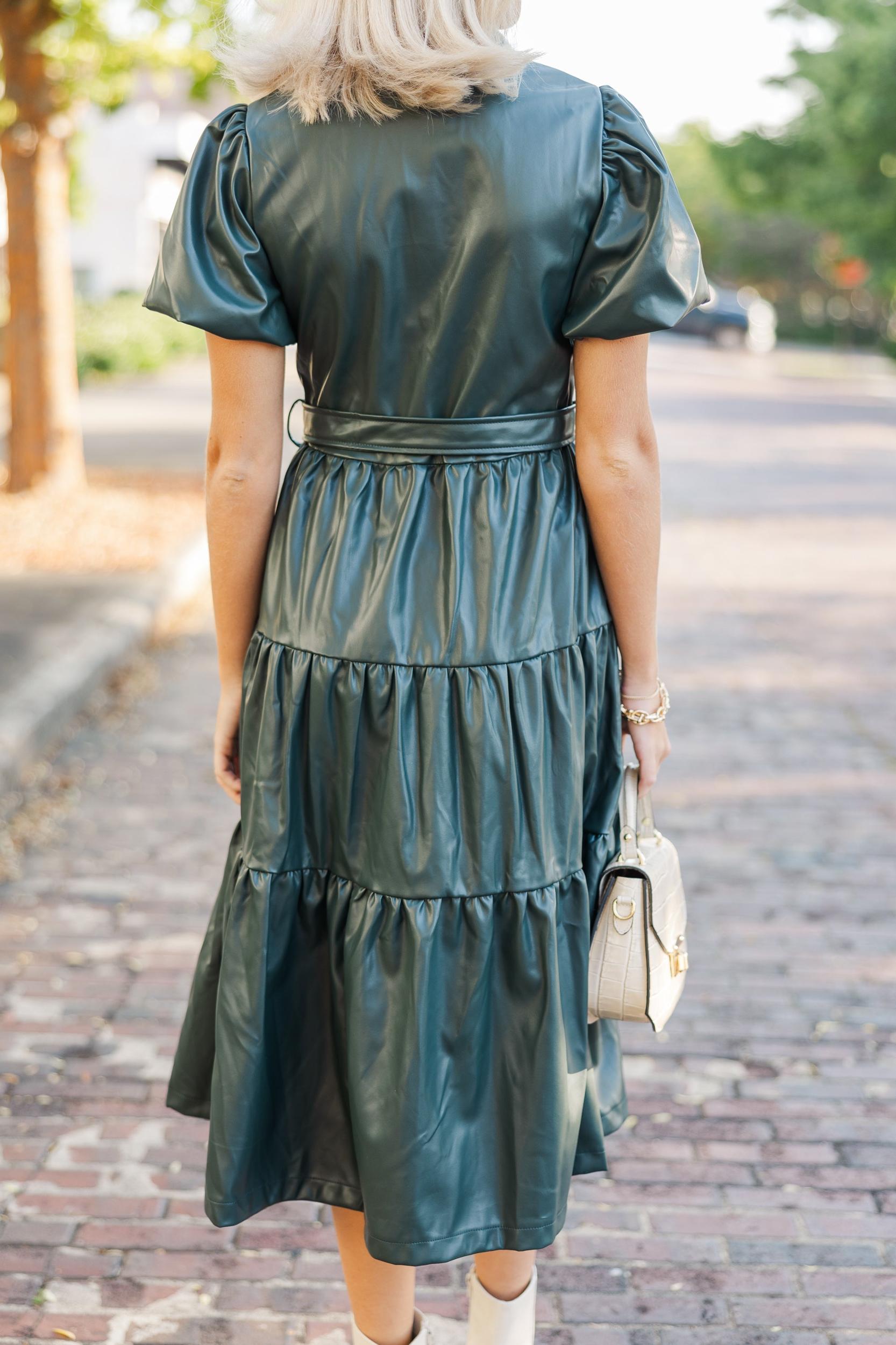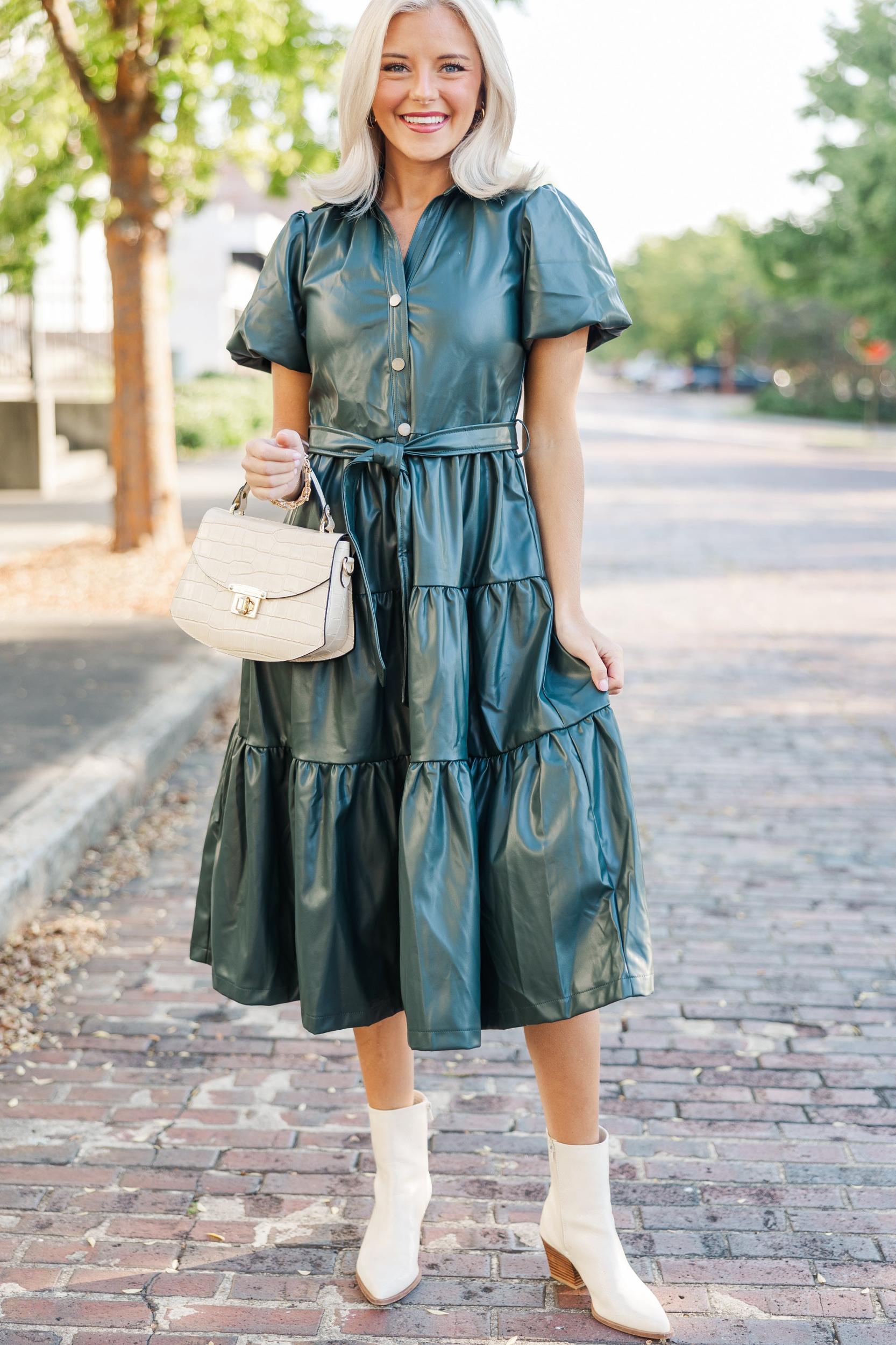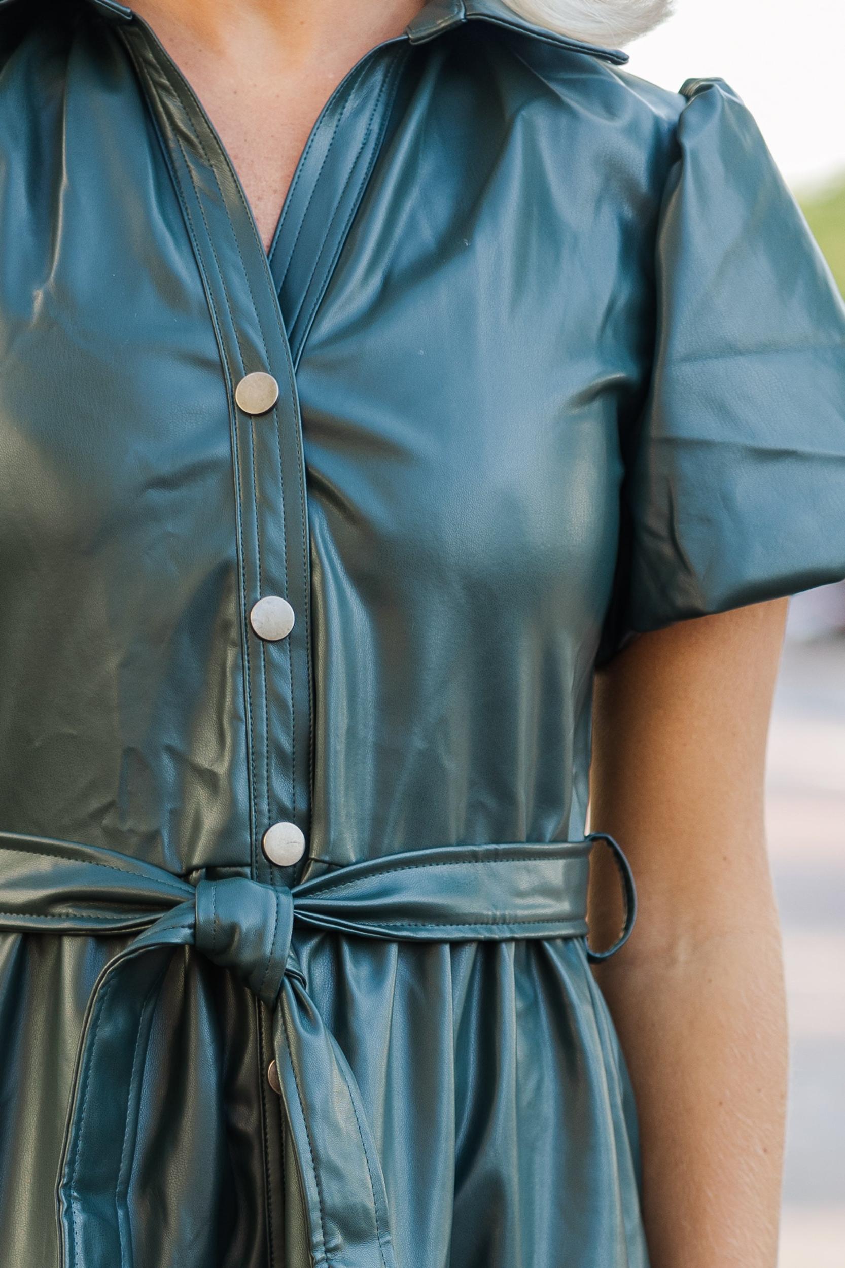 We can't think of a better midi dress for the fall season! That faux leather fabric and that rich hue are just what you are looking for! We also really love that button down design and it's flattering tied waist. Collared neckline Button down front closure Tied waist Short sleeves Faux leather fabric No stretch Payton is wearing the small.