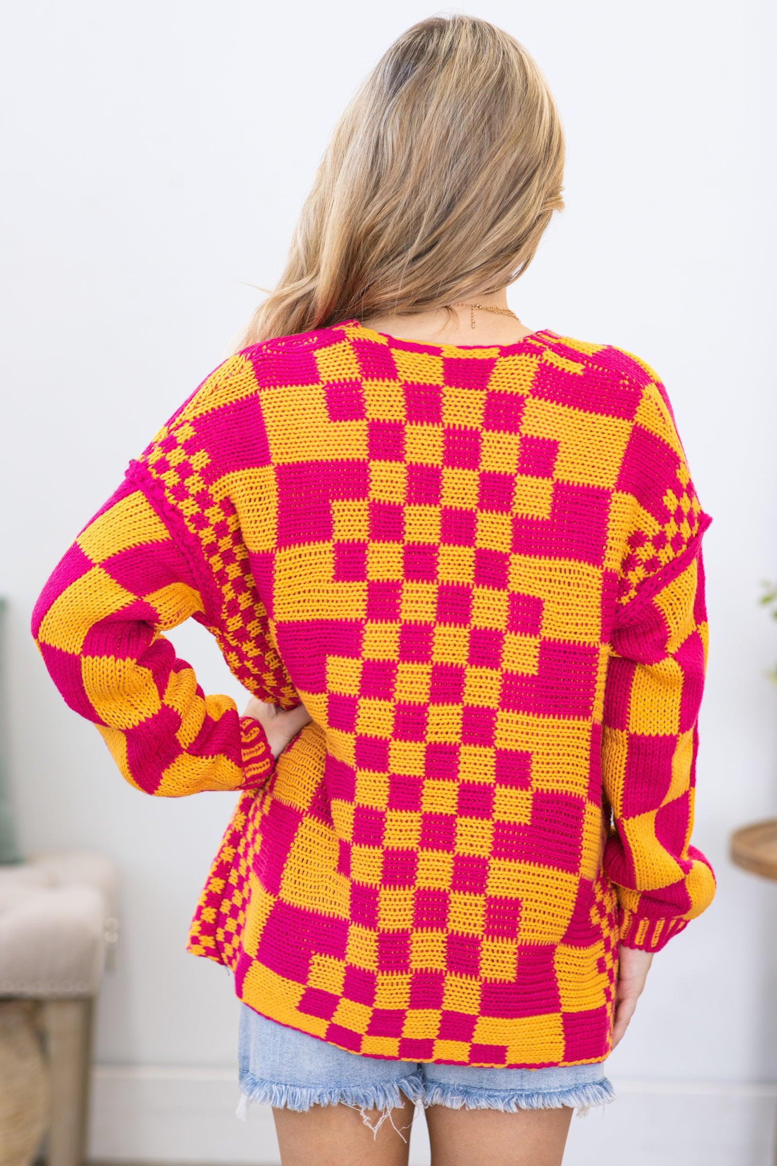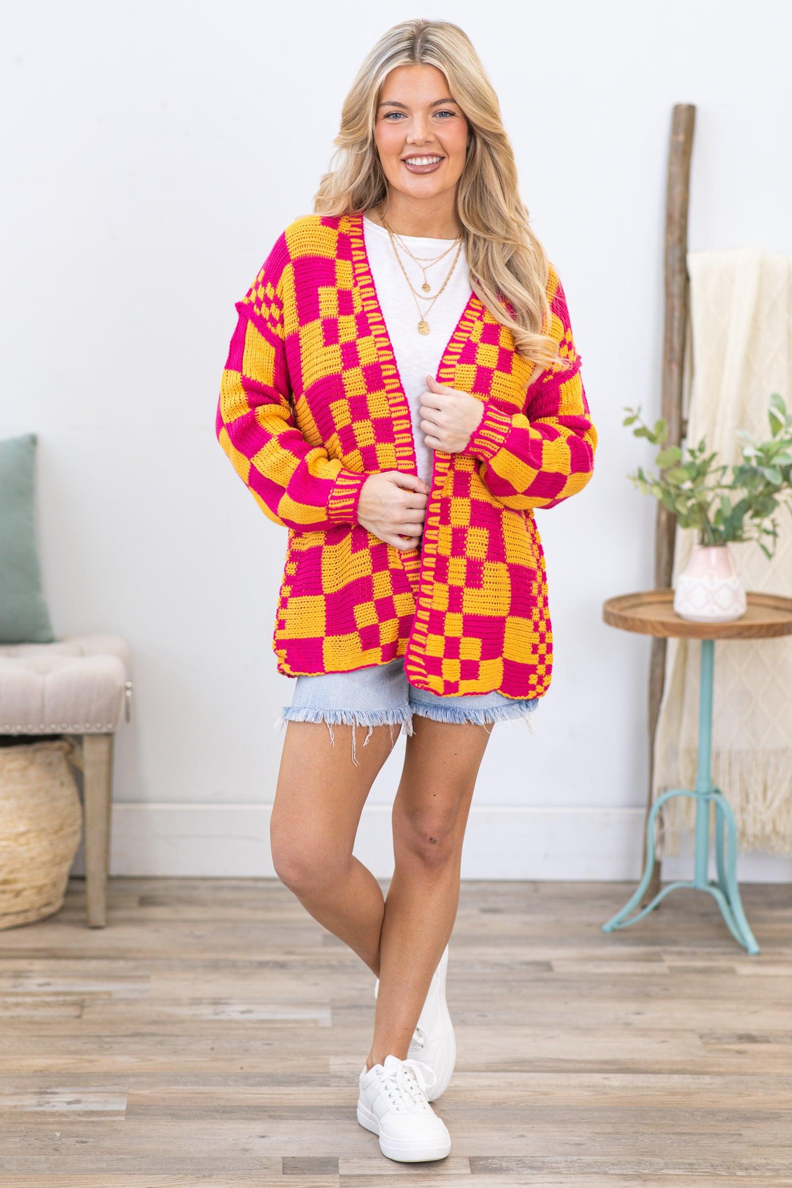 Product Details Colors: Hot Pink, Light Orange Print: Checkerboard Neckline: Open Front Sleeve: Long Sleeve Hemline: Straight Material and Care 100% Acrylic Machine Wash Cold Hang/Line Dry Size and Fit Small: Bust 46" Waist 44" Length 24.5" Medium: Bust 48" Waist 46" Length 25" Large: Bust 50" Waist 48" Length 25.5" X Large: Bust 52" Waist 50" Length 26" Photo model is 5'4 and wearing a size small Video model is 5'8 and wearing a size small