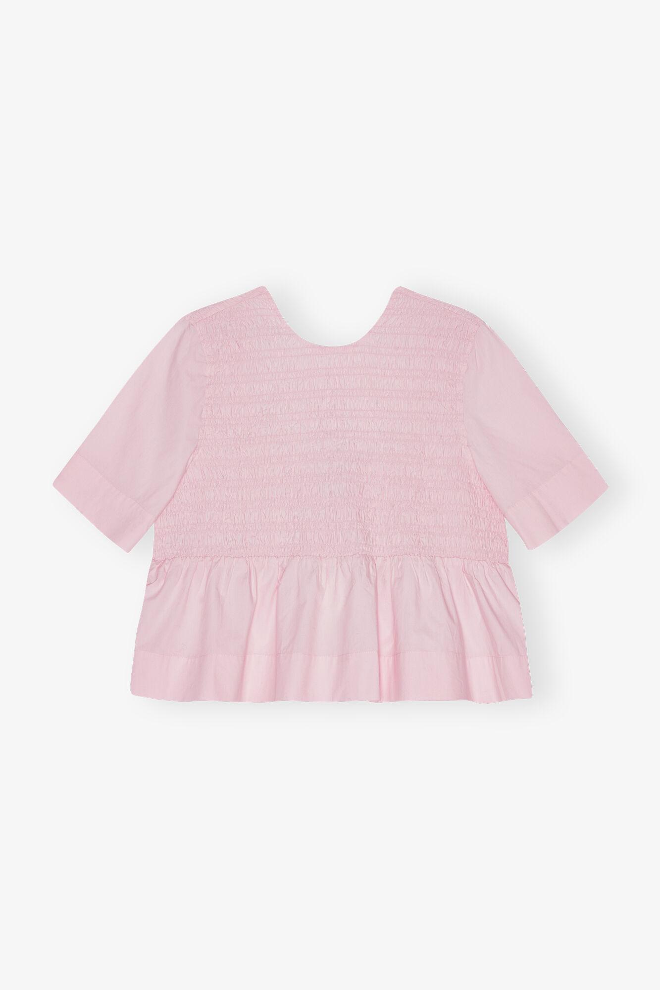 This Pink Cotton Poplin Open Back Smock Blouse features a round neckline, a smocked bodice and short sleeves. The blouse has an open back and a ruffle hemline.