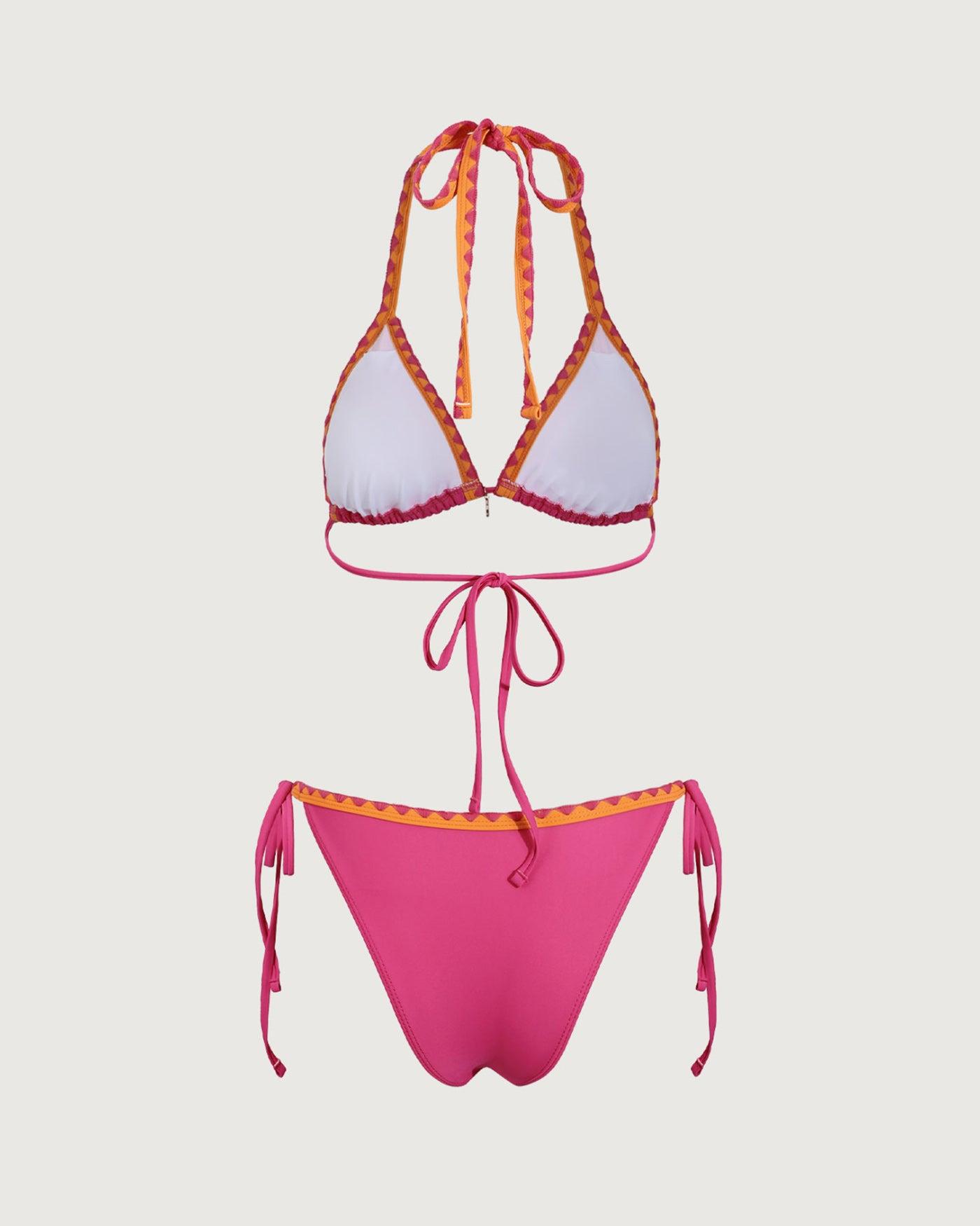 - Back Neckline: Strappy - Fabric Stretch: High Stretch - Waist: Low Waisted - Closure Type: Drawstring - Pattern Type: Solid - Embellishment: Contrasting colors, Knot, Tie, Embroidery - Neckline: Halter - Fabric: Polyamide 80.0%, Spandex 20.0% - Lining: Polyester 90.0%, Spandex 10.0% - Leg Opening: High Cut Leg - Padding: Removable Soft Cups - Bottom Coverage: Moderate Bottom Coverage - Bra Coverage: Demi