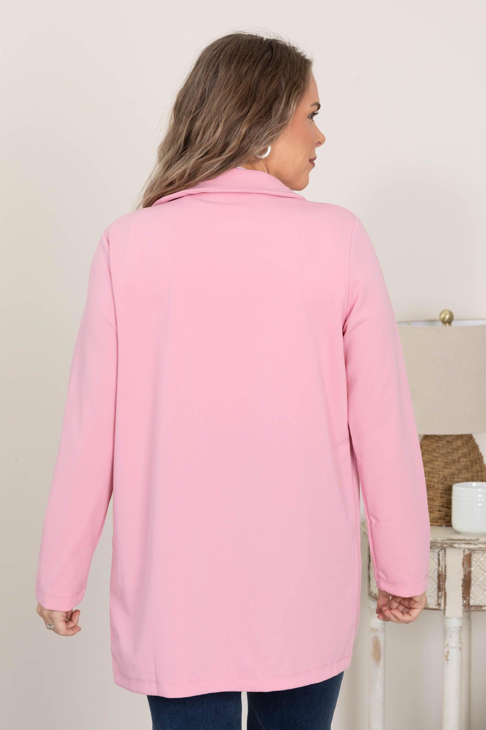 Product Details Colors: Pink Print: Solid Neckline: Open Front Sleeve: Long Sleeve Hemline: Straight Brand: Timing Material and Care 95% Polyester 5% Spandex Hand Wash Cold Hang/Line Dry Size and Fit Small: Bust 40" Waist 40" Length 32" Medium: Bust 42" Waist 42" Length 32.5" Large: Bust 44" Waist 44" Length 33" Erica is 5’7” and wearing her true size small