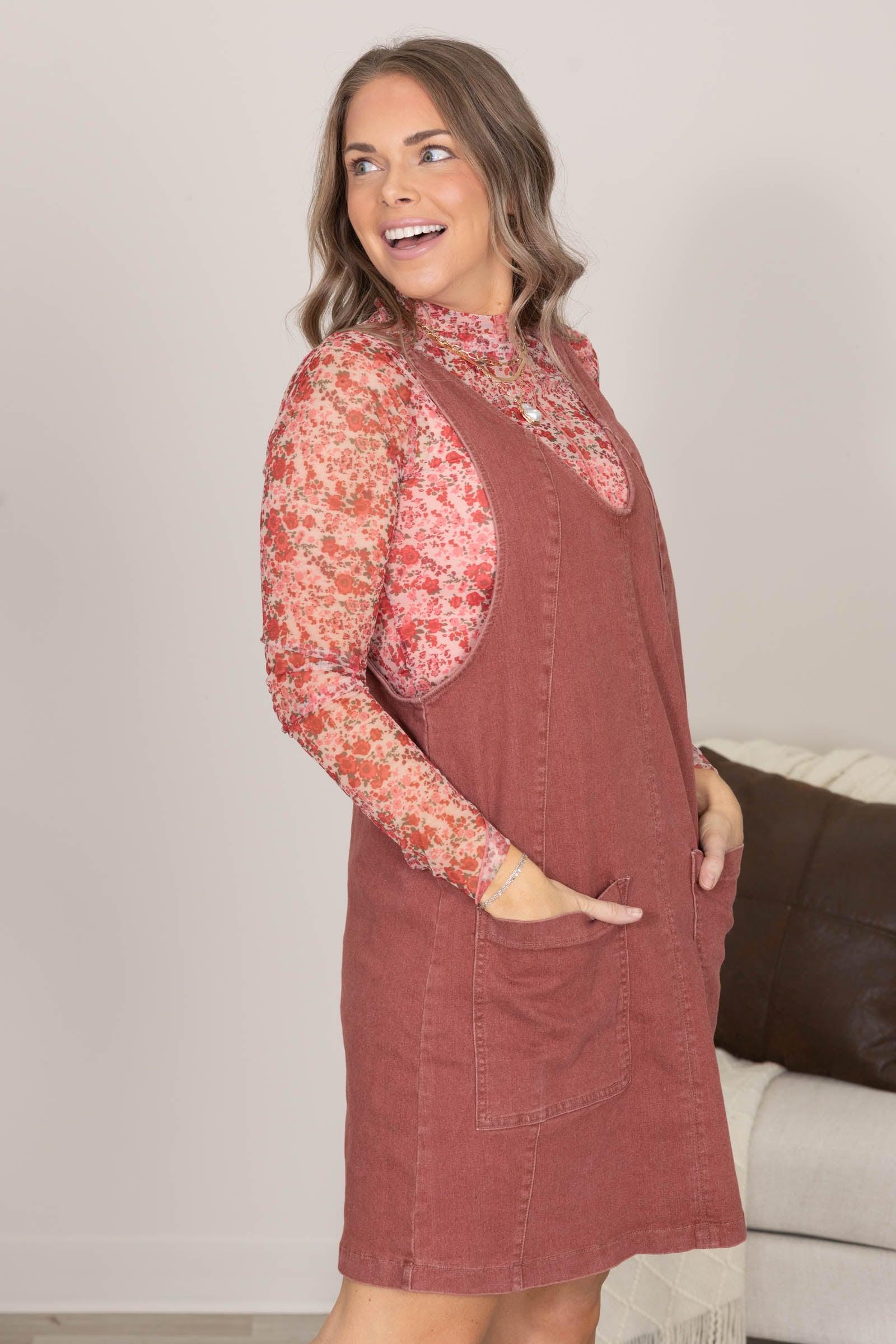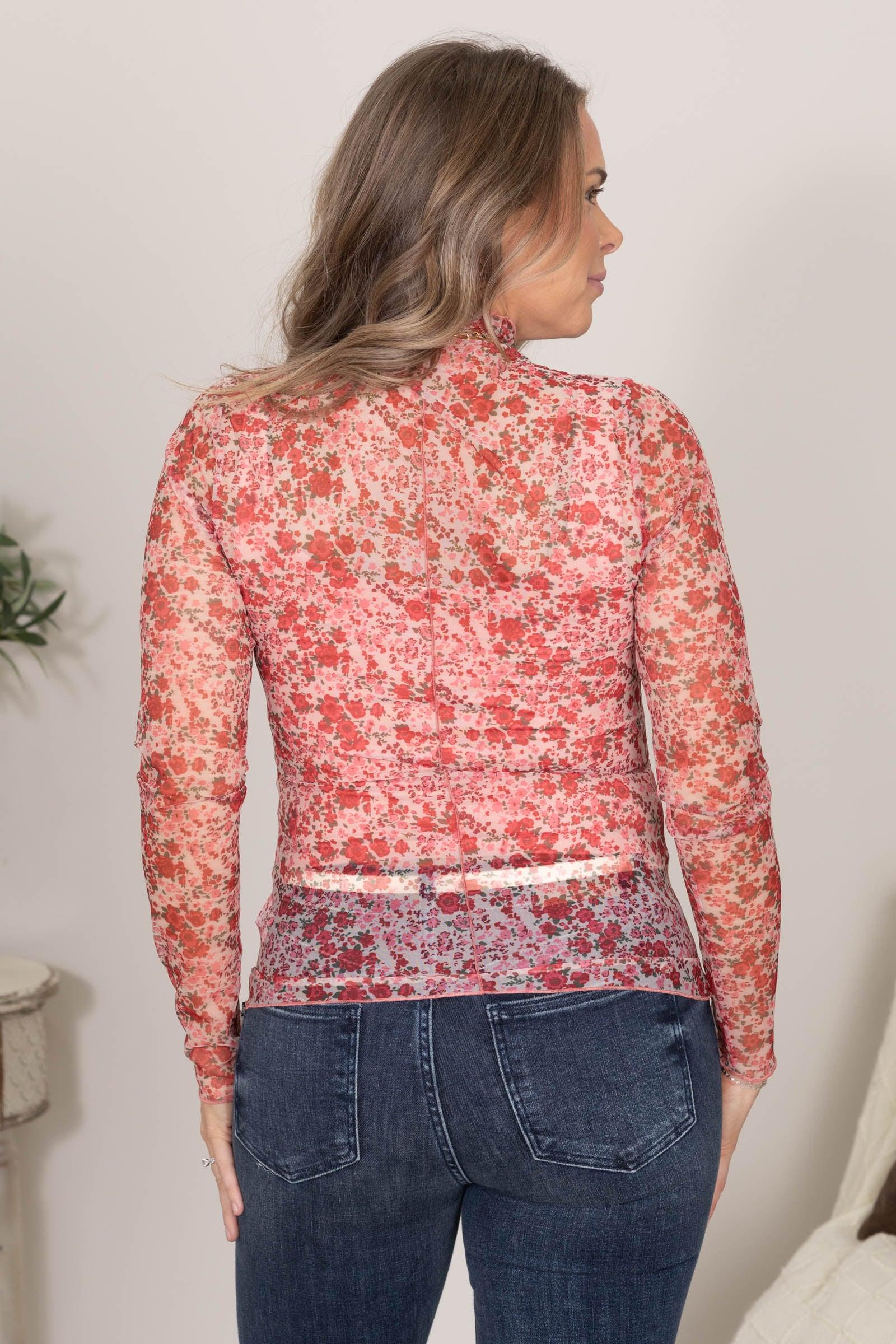 Product Details Colors: Pink, Raspberry, Red, Hunter Green Print: Floral Neckline: Mock Neck Sleeve: Long Sleeve Hemline: Straight Brand: Anniewear Material and Care 90% Polyester 10% Spandex Hand Wash Cold Hang/Line Dry Size and Fit Small: Bust 32" Waist 30" Length 25" Medium: Bust 34" Waist 32" Length 25.5" Large: Bust 36" Waist 34" Length 26" X Large: Bust 38" Waist 36" Length 26.5" Erica is wearing a size small