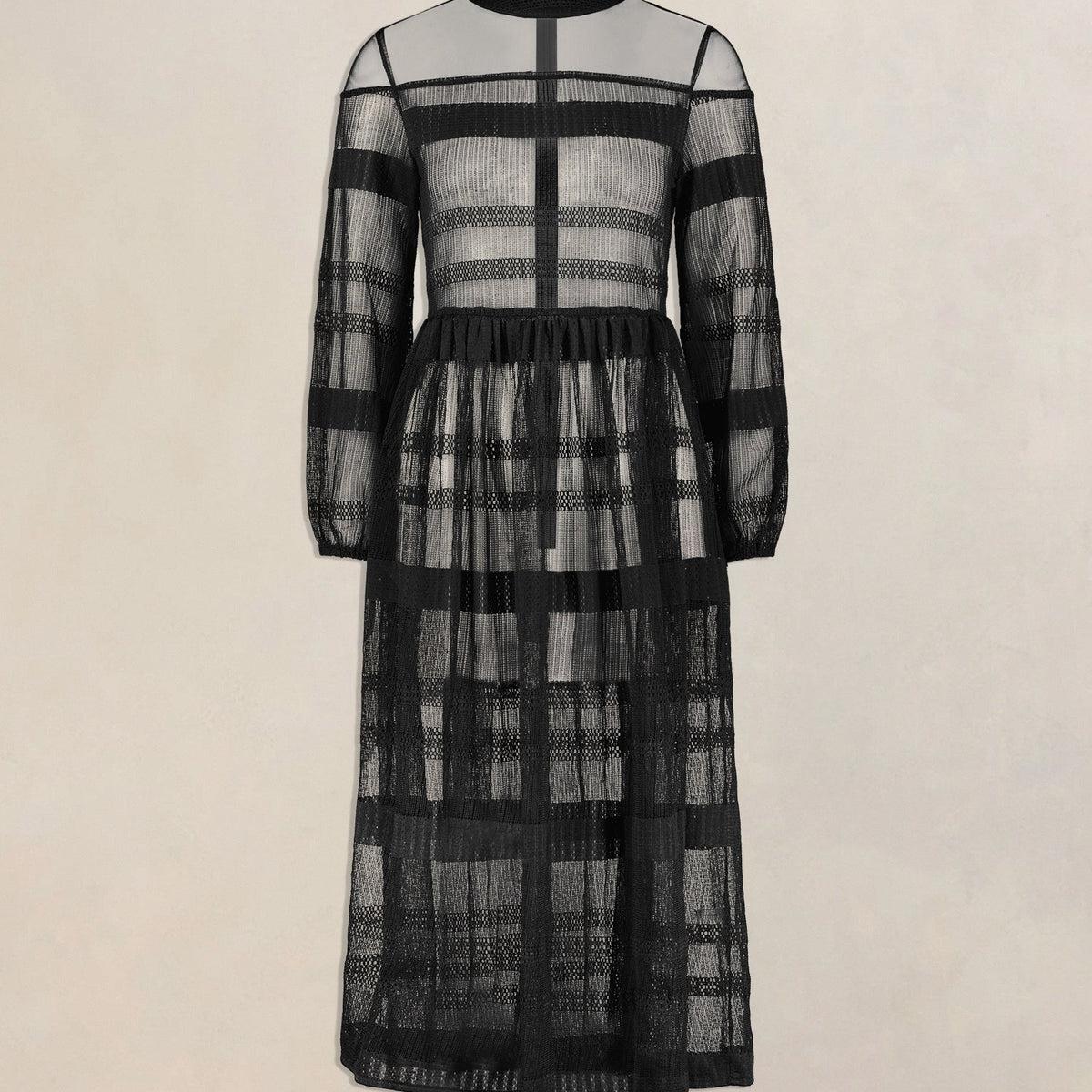 Imagine this: The delicate lace overlay cascades down your figure, creating a romantic and sophisticated silhouette. The long sleeves add a touch of elegance, while the midi length flatters your form without compromising on chicness. But the magic doesn't stop there. The deep black hue exudes timeless glamour, making this dress the perfect pick for any special occasion, from weddings and galas to cocktail parties and romantic dinners.