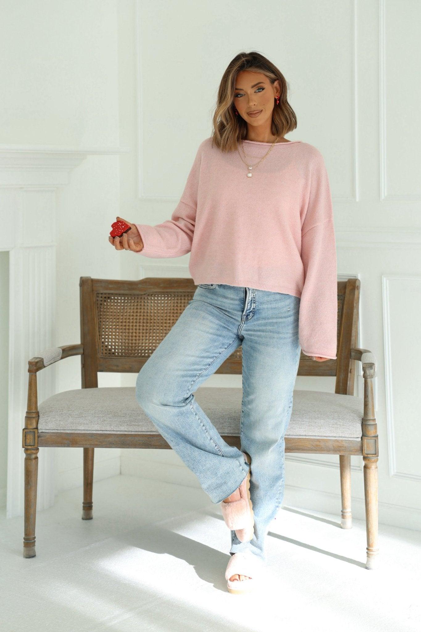 Our Pink Rolled Boat Neck Sweater is the definition of cozy-chic. Designed with a softly rolled neckline and cuffs, this easy pullover style offers a relaxed fit and subtle ribbed detailing for timeless appeal. The lightweight yet warm knit makes it the perfect layering piece for crisp fall days, effortlessly pairing with jeans, skirts, or tailored trousers.