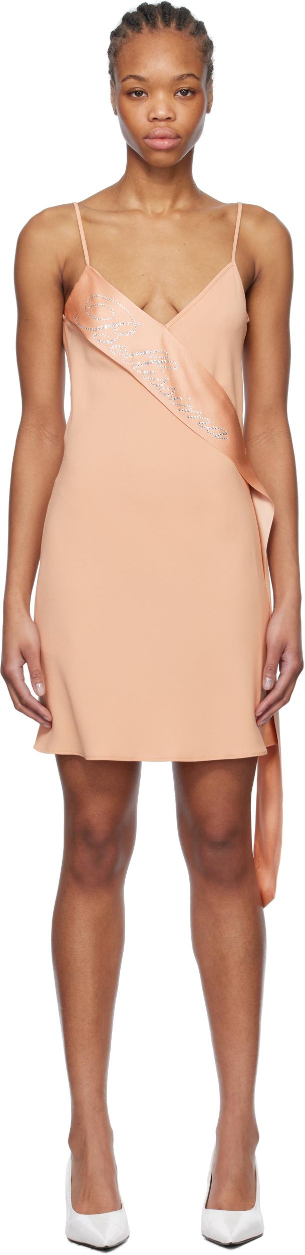 Stretch acetate-blend satin crêpe minidress. · V-neck · Sash-style overlay with crystal-cut text appliqué · Fixed spaghetti straps · Low back · Central seam at back · Unlined Supplier color: Eyeshadow pink