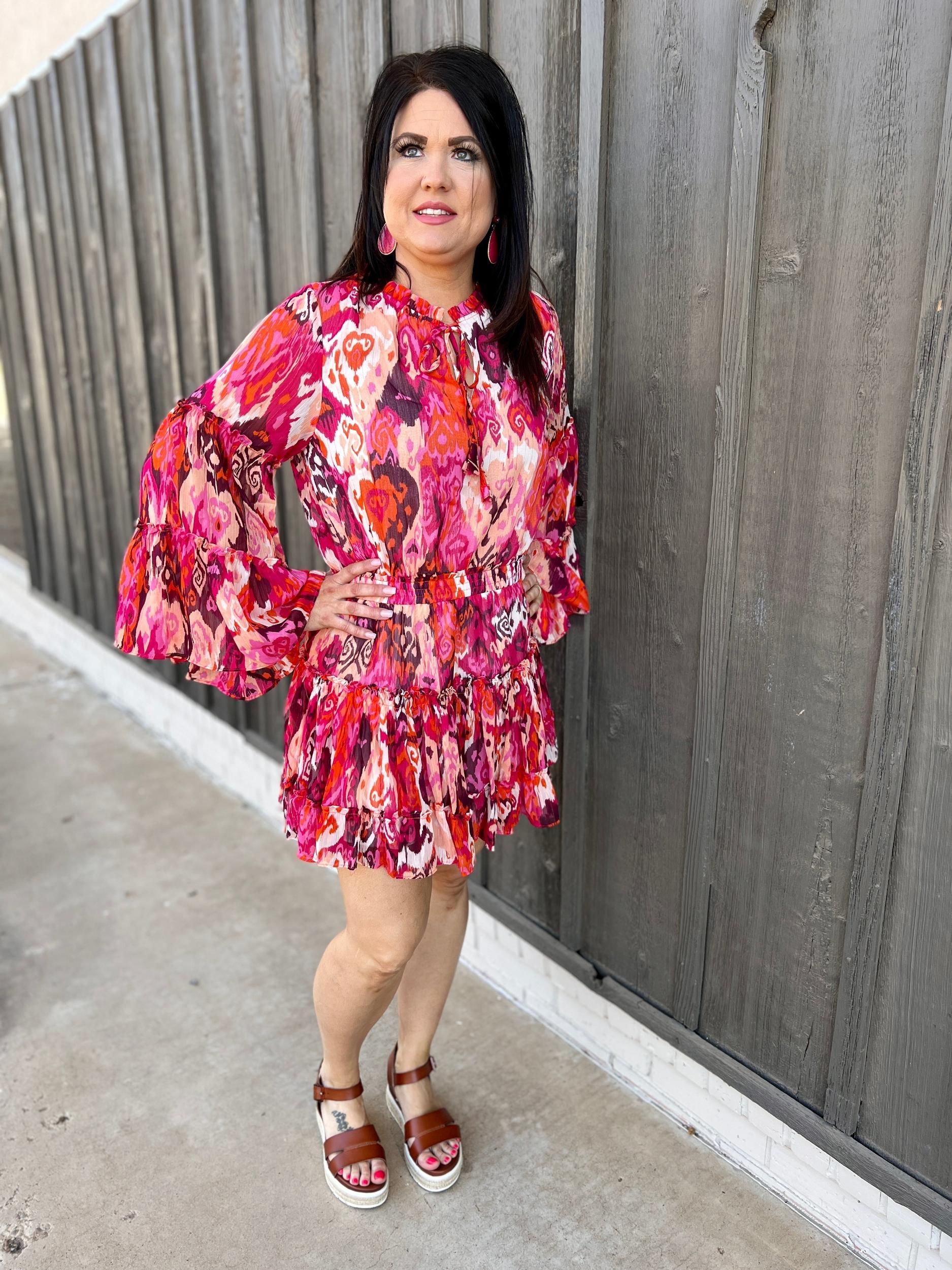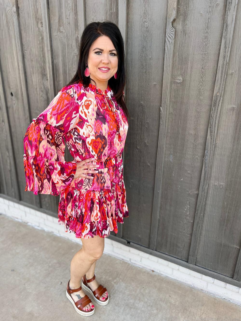 "Be the belle of the ball (or brunch) in our Pink Southern Bell Mini Dress. This playful dress features flirty bell sleeves, a vibrant pink printed design, and ruffled details for a touch of whimsy. Perfect for any occasion, this mini dress will have you feeling fun and feminine!"