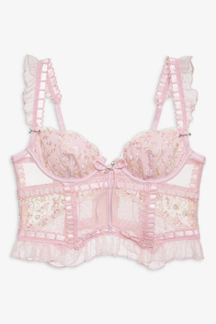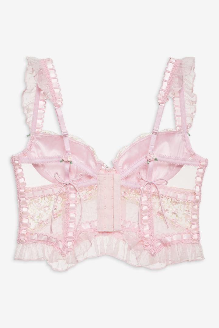 Designed for a romantic summer, the Peekaboo pink bustier exudes femininity with soft embroidered underwire cups and heavenly tulle ruffles at the hem and shoulders. This bustier top is finished with ribbon and loop trims and sweet rosettes.