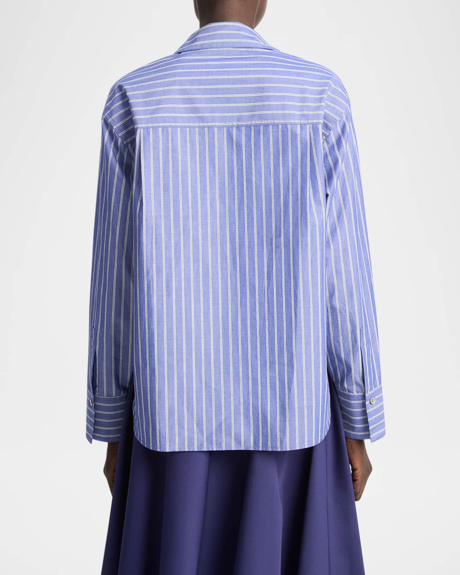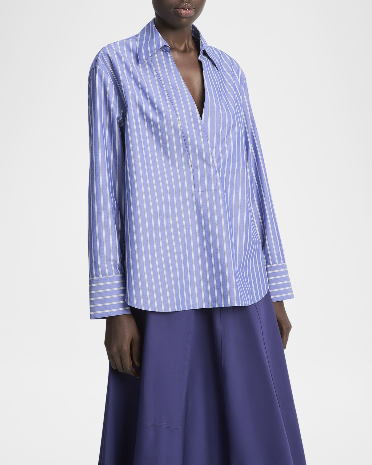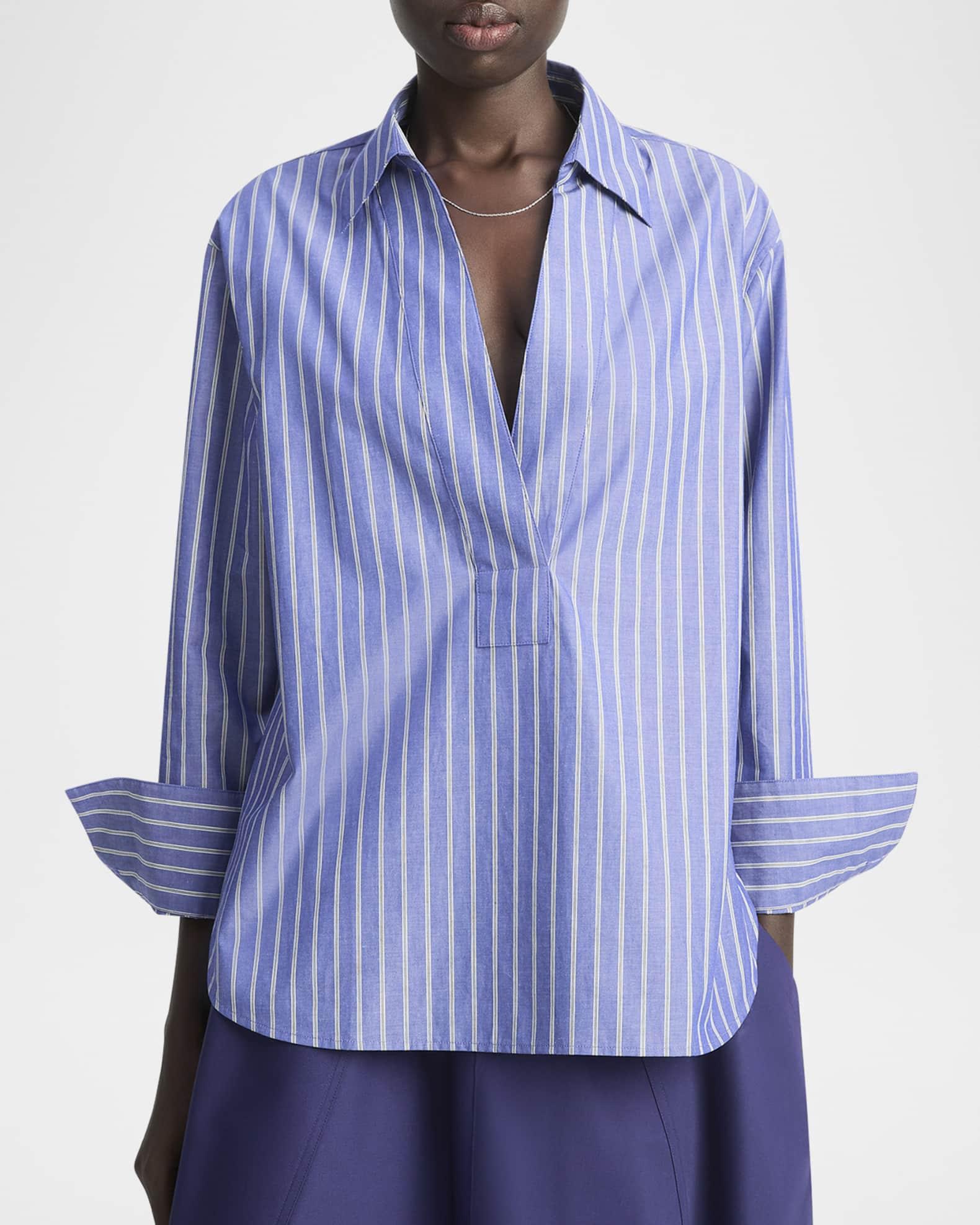 Vince pinstripe crisp cotton poplin shirt Point collar; V neckline Long sleeves with button cuffs Relaxed fit Hem falls to the hip Pullover style Cotton Dry clean or machine wash cold Imported