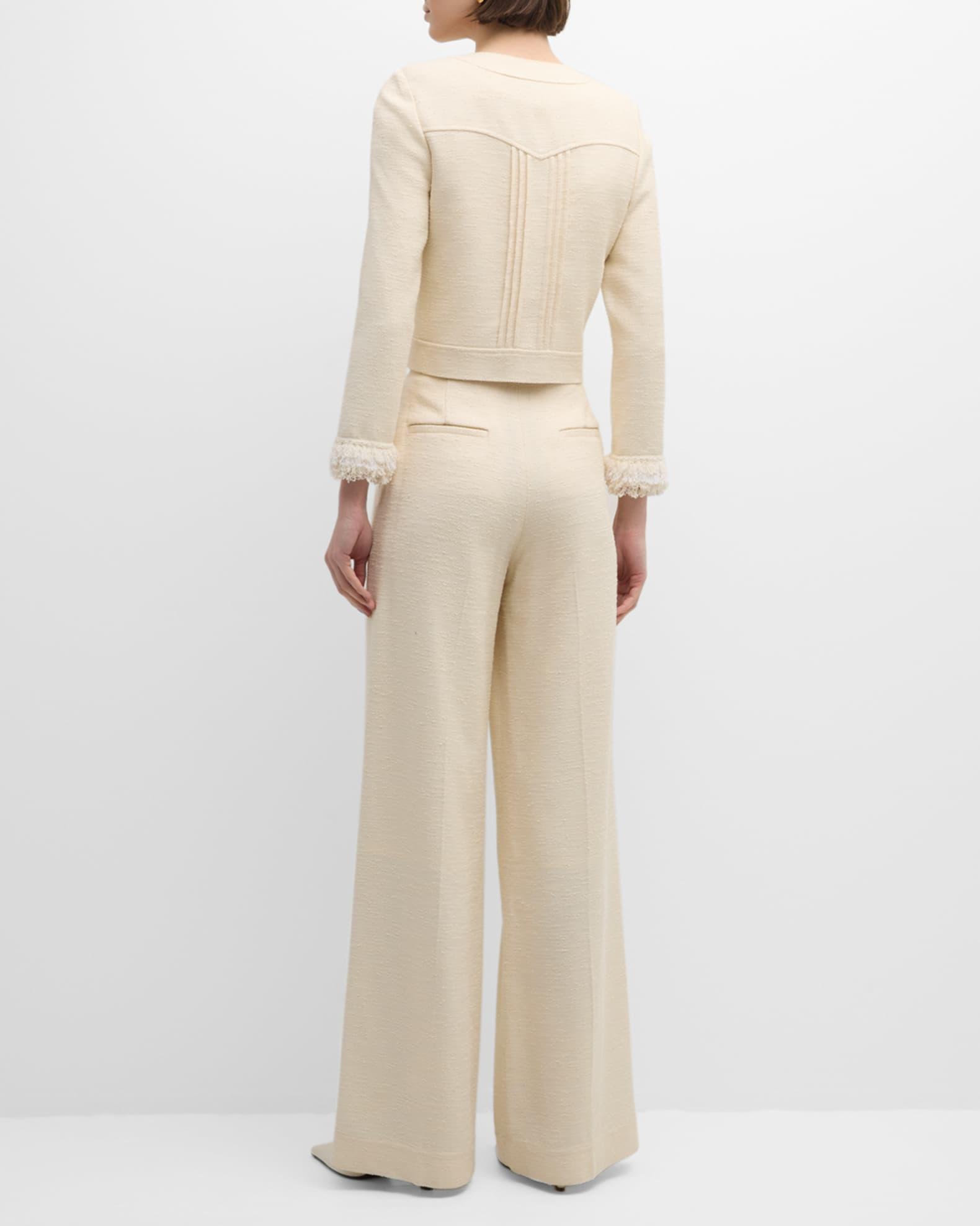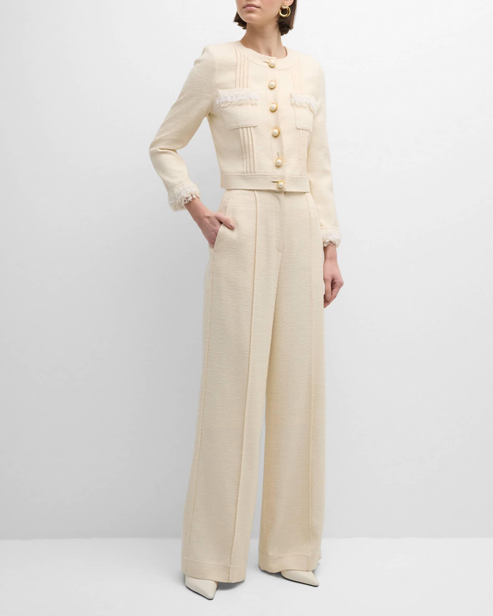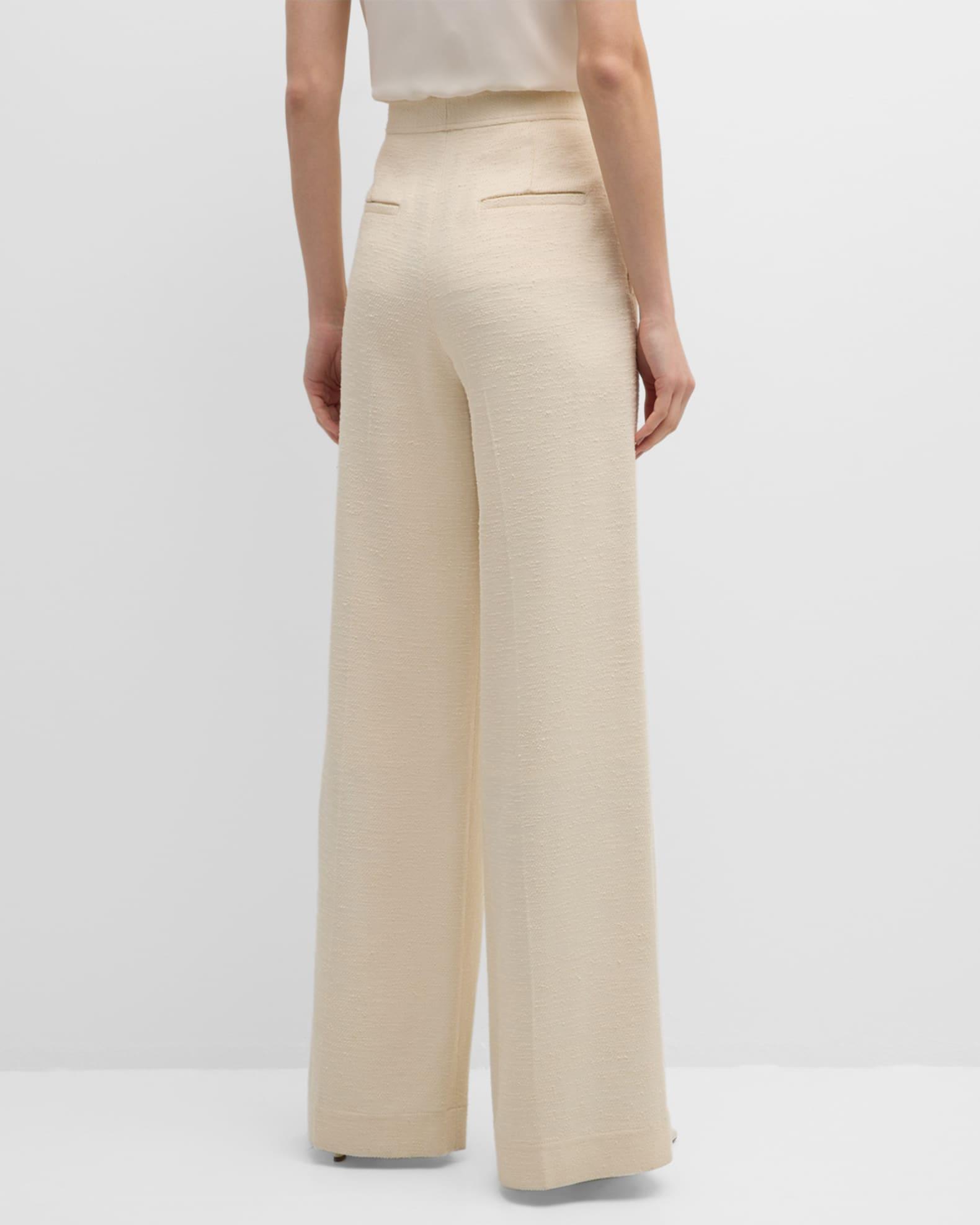 St. John Italian fluid tonal tweed pants featuring a pintuck front detail Mid rise sits high on hip Side slip pockets; back welt pockets Wide legs Full length Hook/zip fly Viscose/cotton/nylon/polyamide Partially lined Professional cleaning recommended Made in USA Model is 5'10"/177cm.