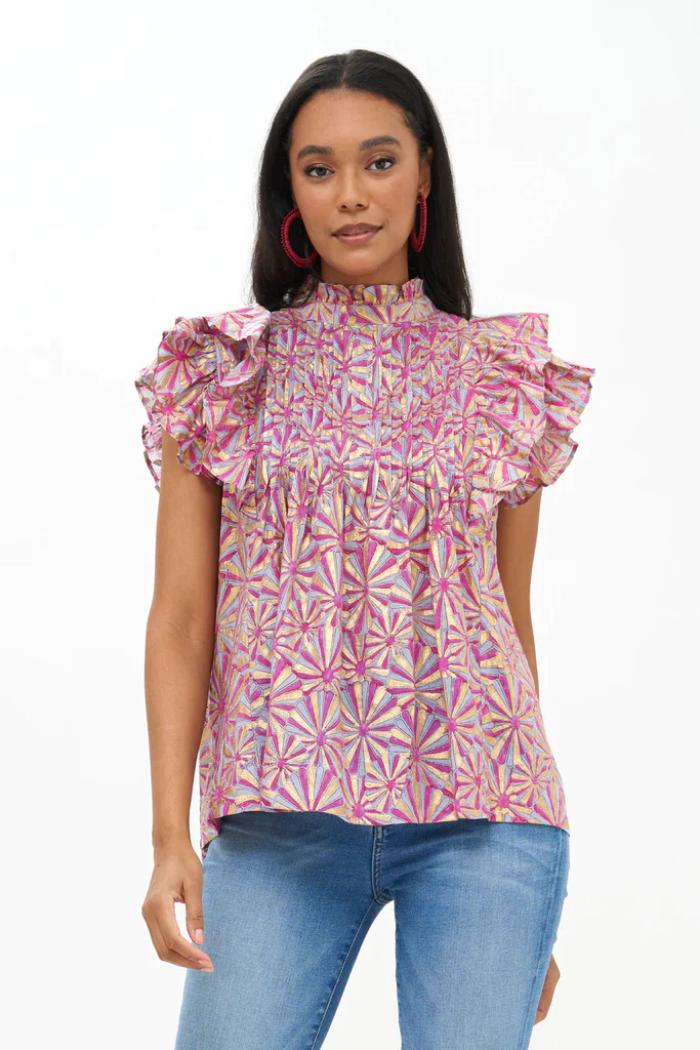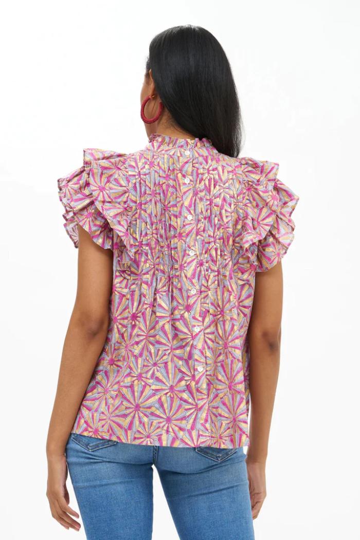 Hand-block printed with gold detailing on cotton voile. Pintuck detailing down the front and back. Statement ruffle cap sleeves. Ruffle detailing along the collar. Button features down the length of the back. Model is 5'8" and is shown wearing a size Small. Care Instructions: Wash on a cold delicate cycle with gentle d