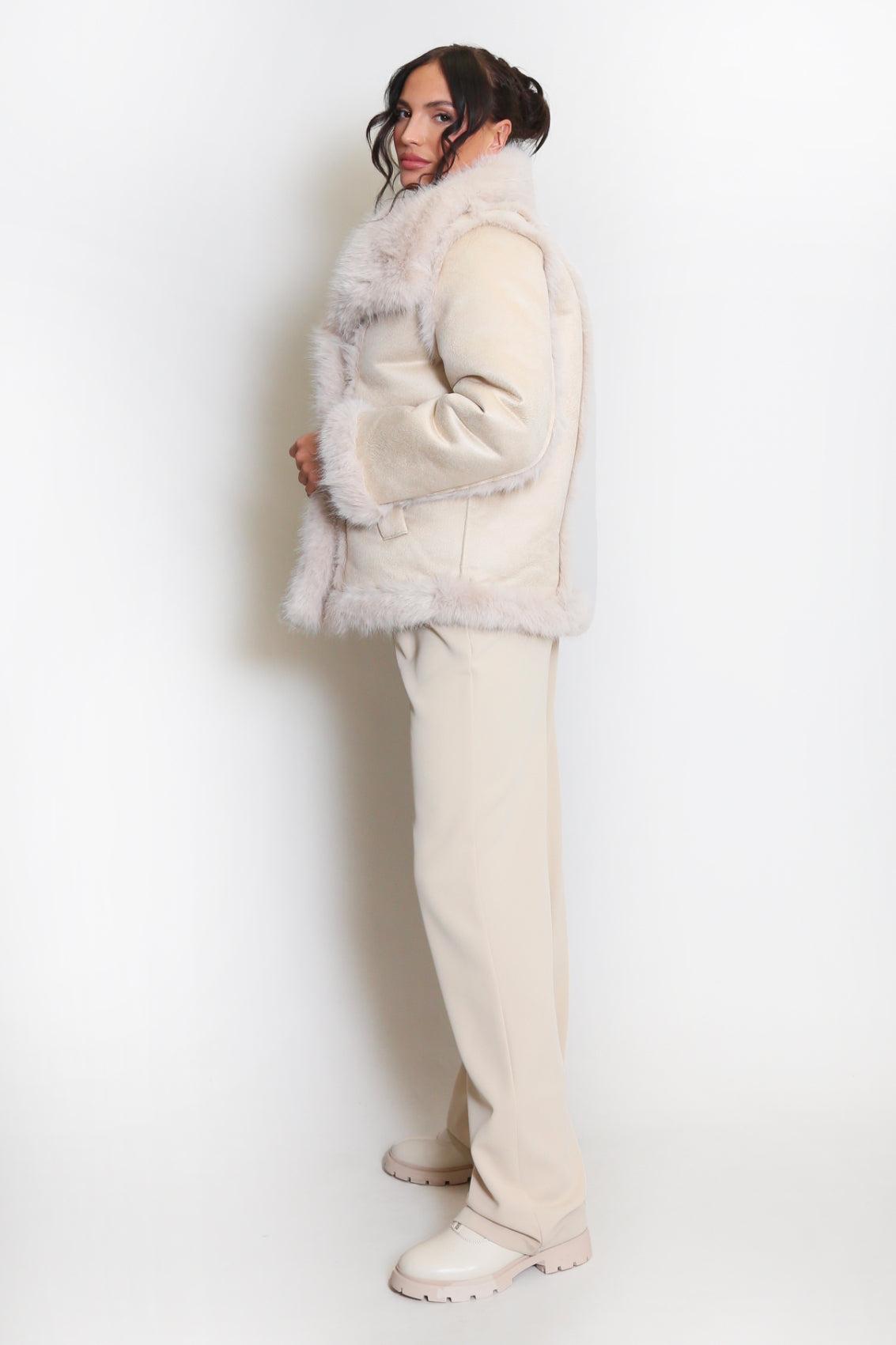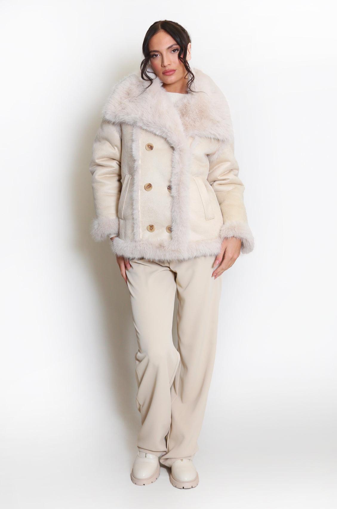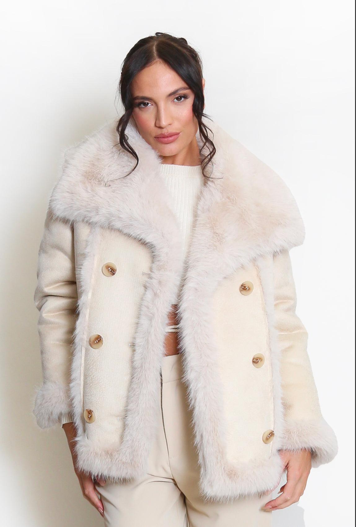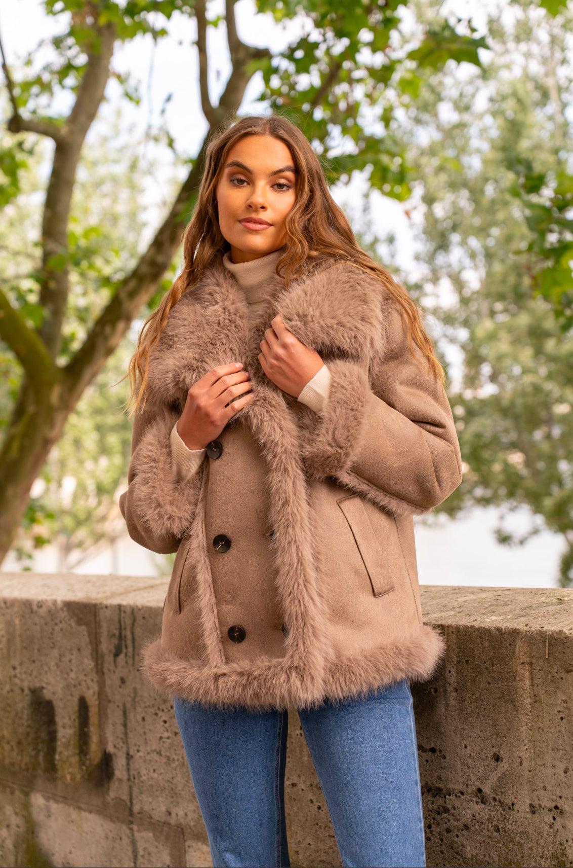 This PIPER MINI COAT features a double-breasted style, chunky faux fur trim, and a reversible design. Made with a fabric composition of 100% polyester, it offers a luxurious, yet practical option for cold weather.