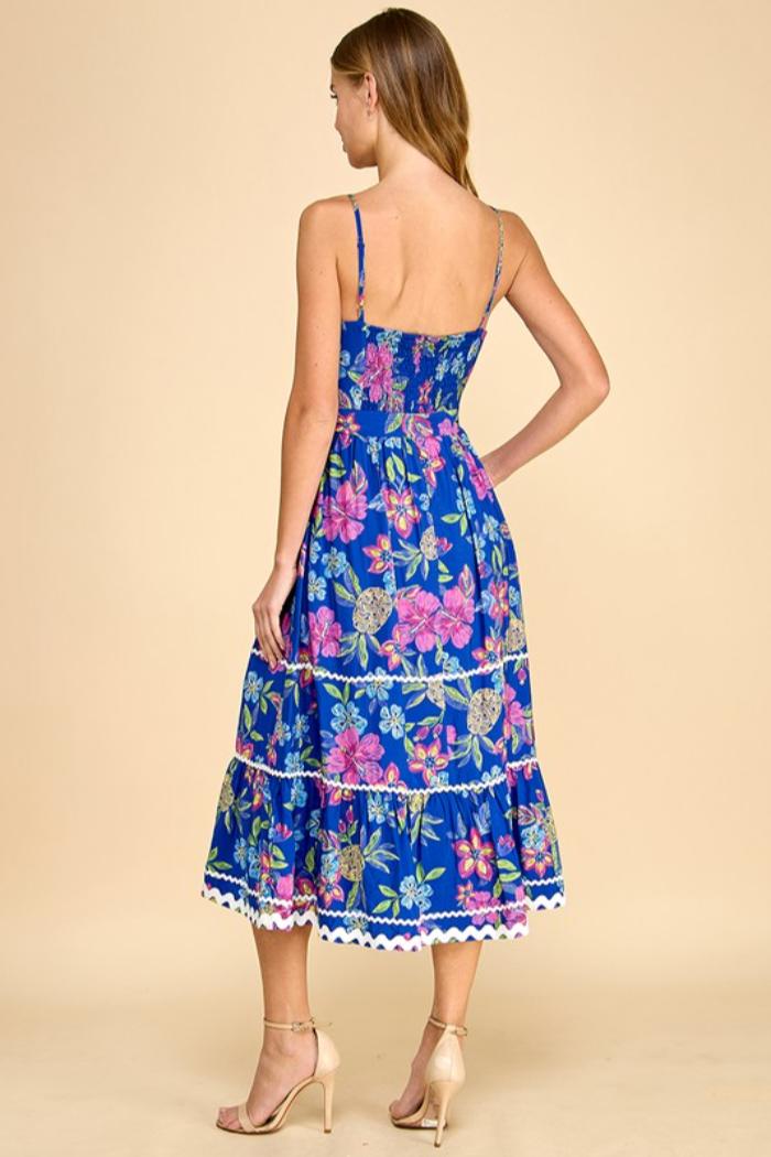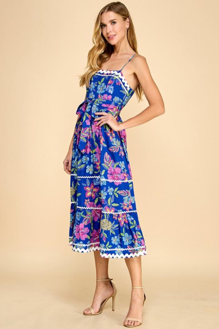 Faux embroidered-style floral printed midi dress with accented ricrac trim throughout, featuring an attachable belt.