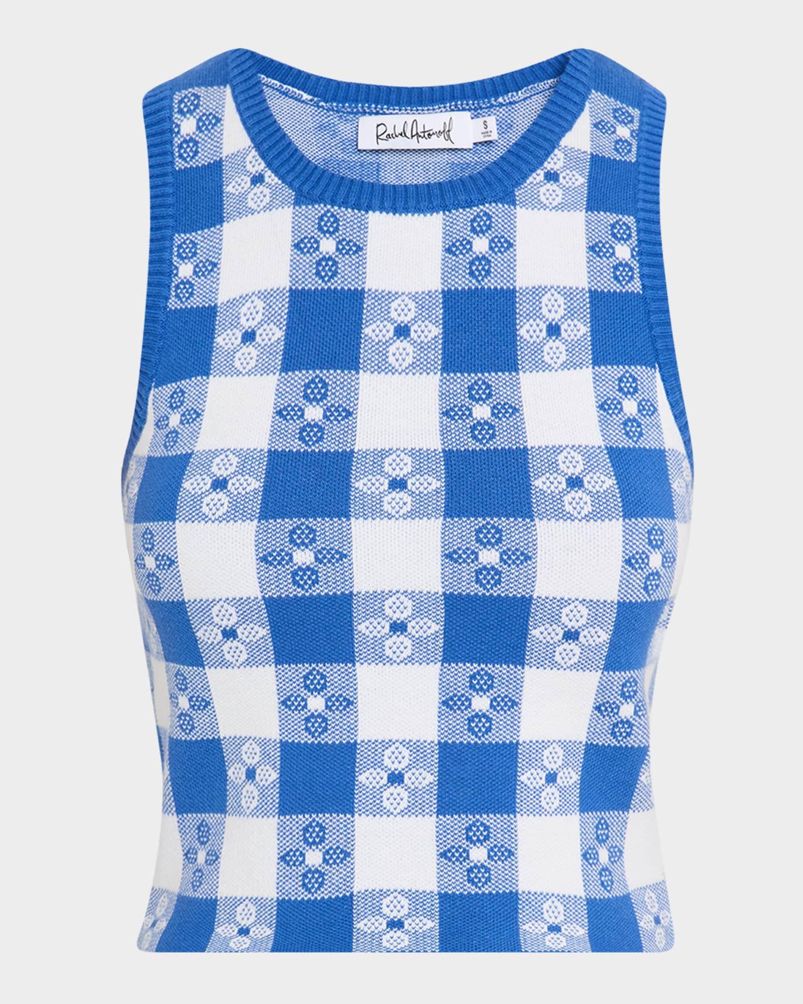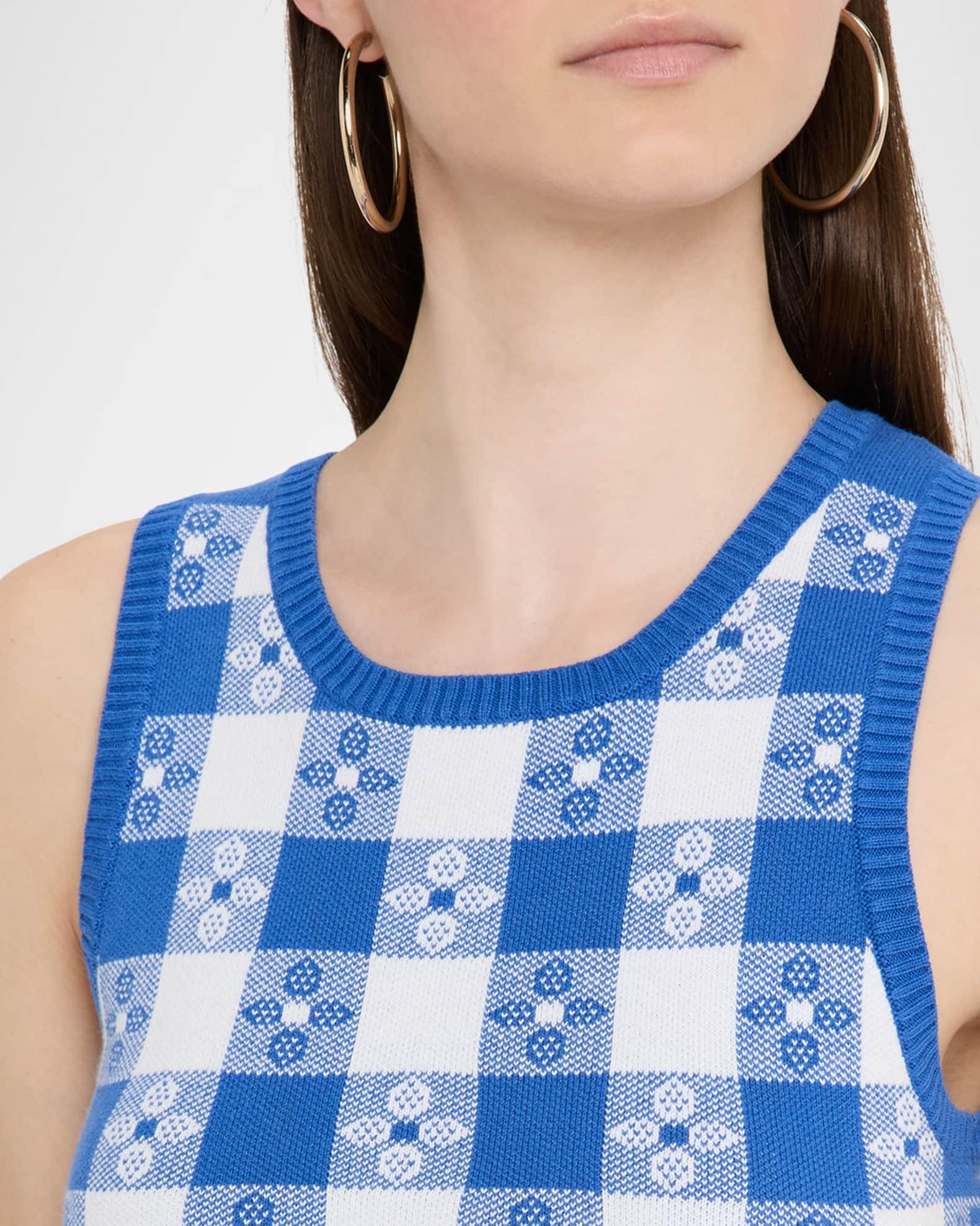 Rachel Antonoff "Pippa" shell sweater in a gingham tablecloth print Ribbed crew neckline Sleeveless Shrunken fit Cropped length Pullover style Cotton Imported