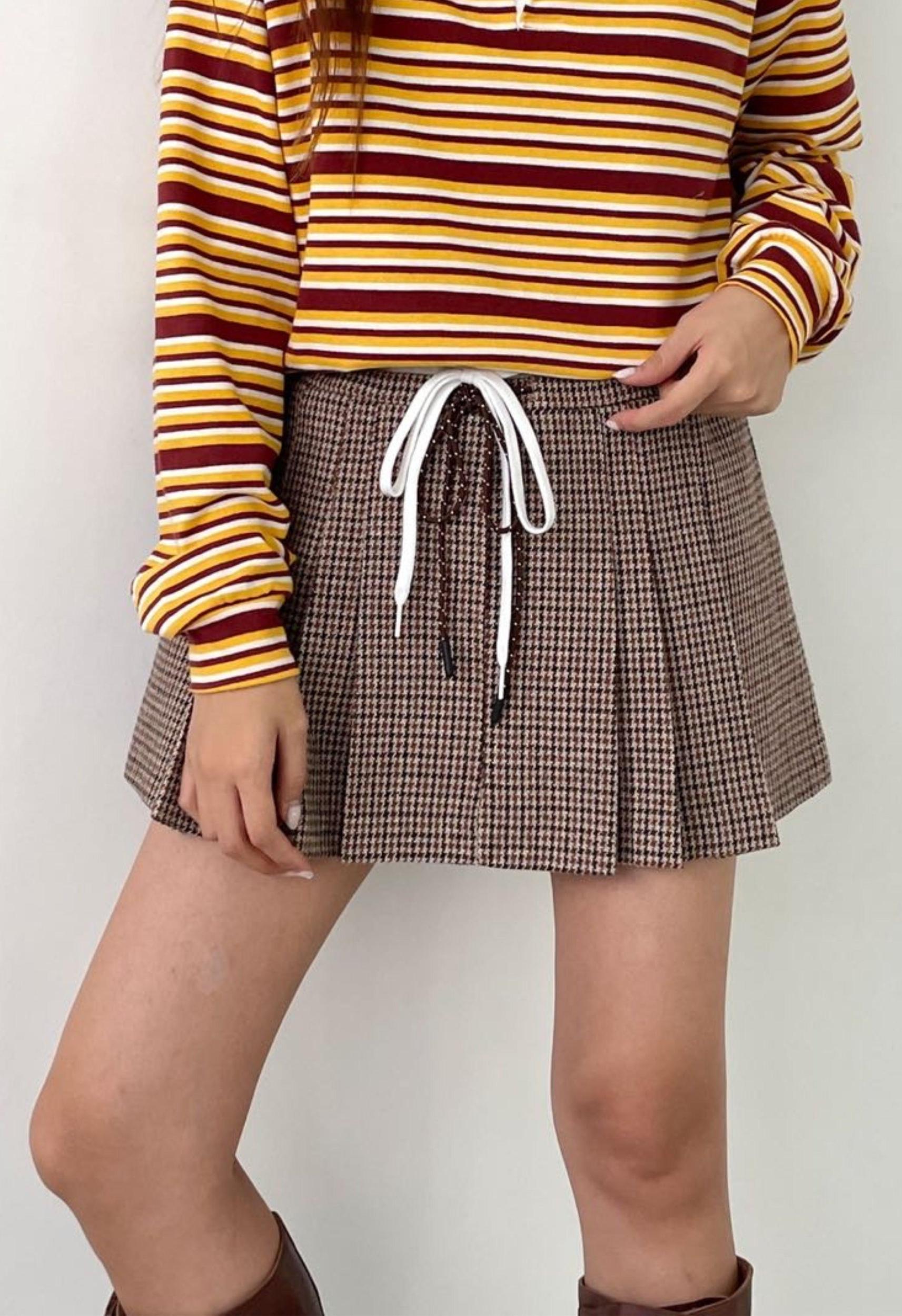 One Size: XS-L Color: Brown Houndstooth Mini Skort Extra Elastic Waistband Double Drawstring Waist Ties Pleated 70% Polyester 28% Rayon 2% Spandex Measurements Length: 13in / 33cm Waist: 28in / 71cm