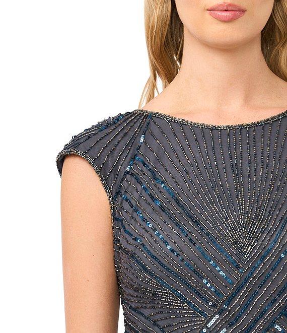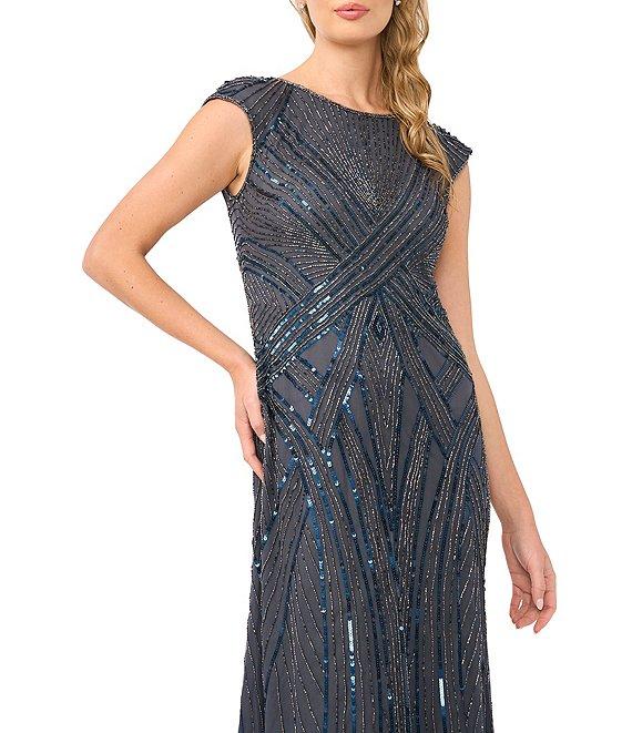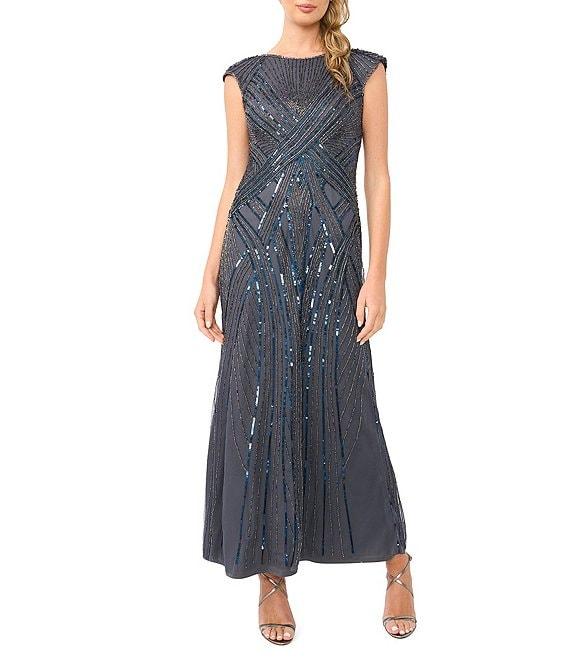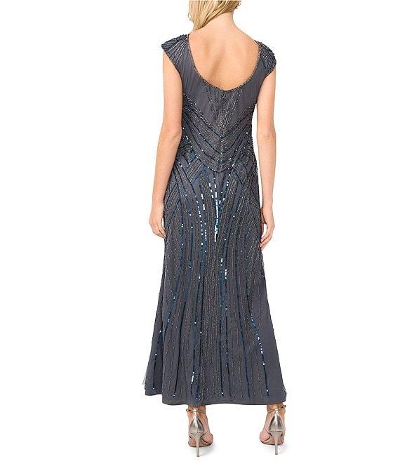 Pisarro Nights Beaded Mesh Boat Neck Cap Sleeve Blouson Gown