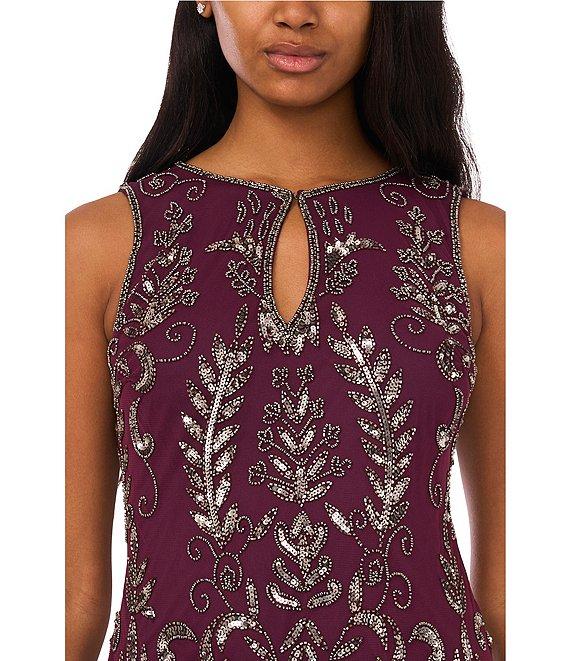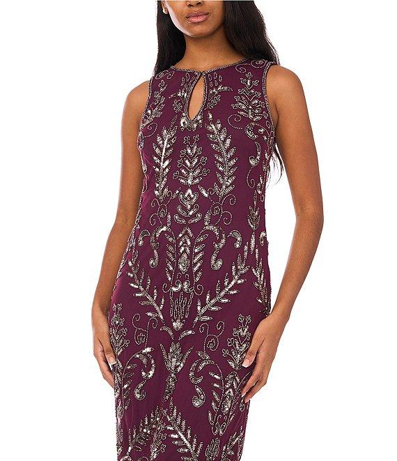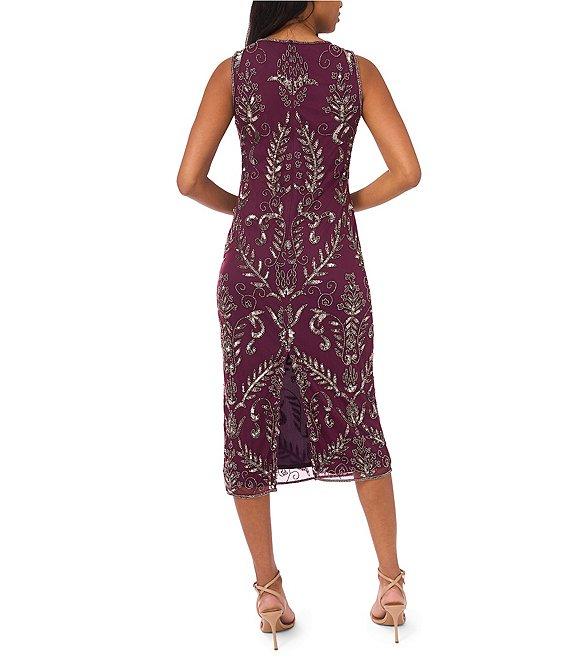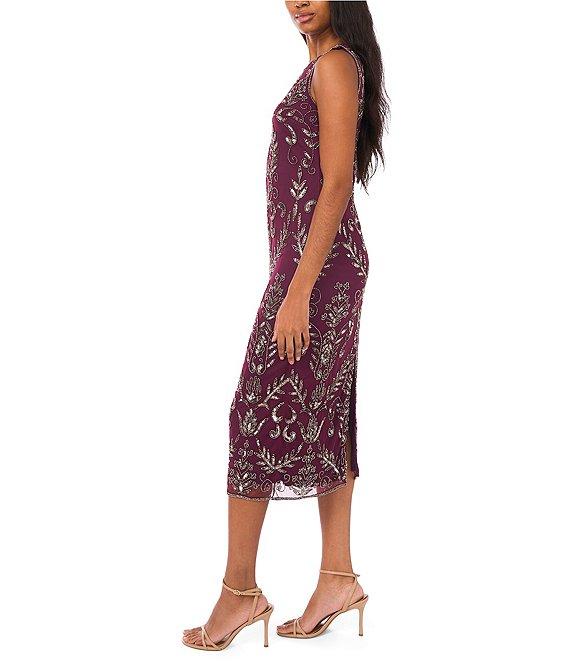 Pisarro Nights Beaded Mesh Crew Keyhole Neckline Sleeveless Sheath Midi Dress