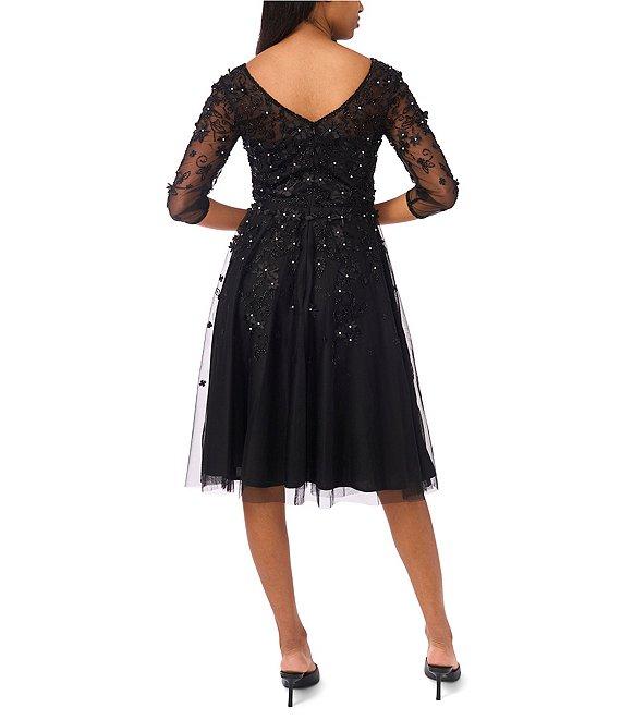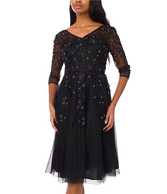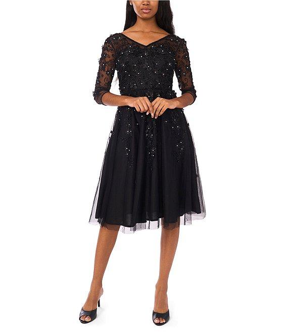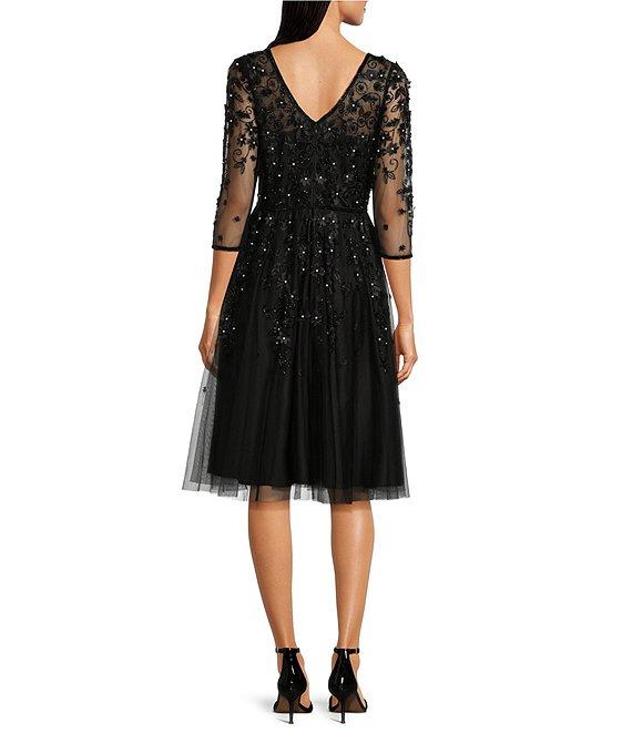 Pisarro Nights Beaded Mesh V-Neck 3/4 Sleeve A-Line Midi Dress