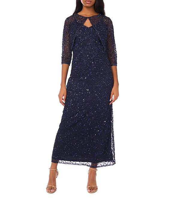 From Pisarro Nights, this 2-piece jacket dress feature Jacket: Beaded mesh fabrication Bolero silhouette Open front neckline 3/4 sleeves Curved hemline Hook & eye closure Rayon Spot clean Dress: Beaded mesh fabrication A-line silhouette V-neckline Sleeveless Spaghetti straps Fully lined Straight hemline Center back zipper closure Approx. 56" length Rayon Spot clean Imported.