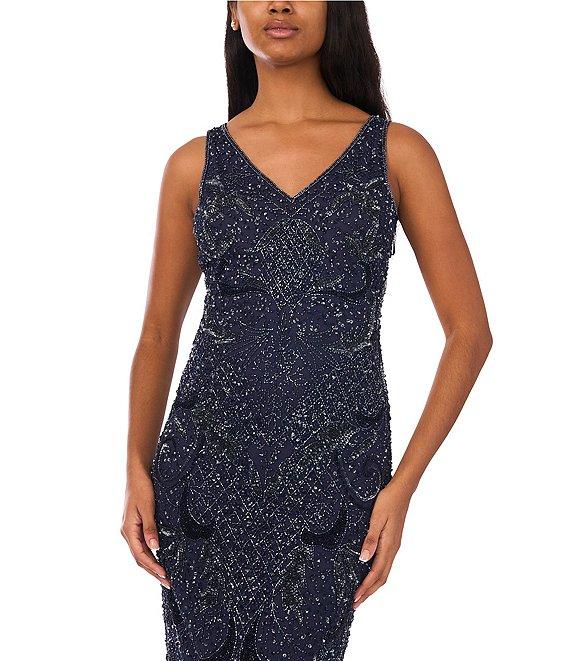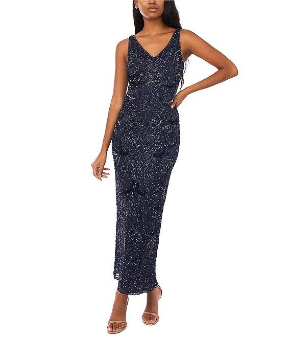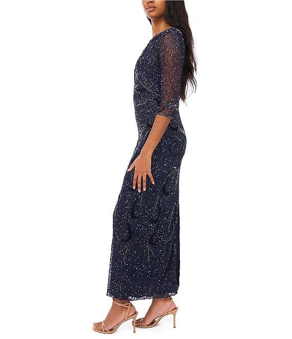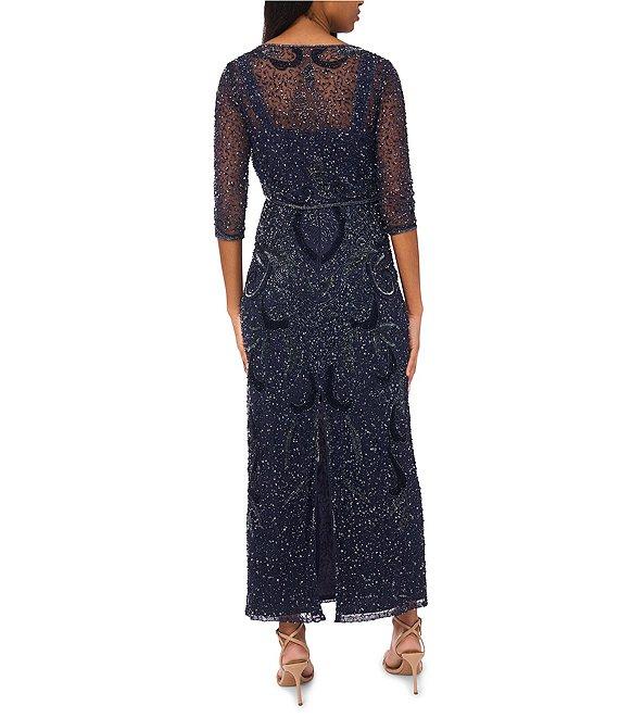 Pisarro Nights Beaded Mesh V-Neck 3/4 Sleeves Jacket Dress