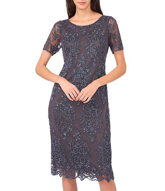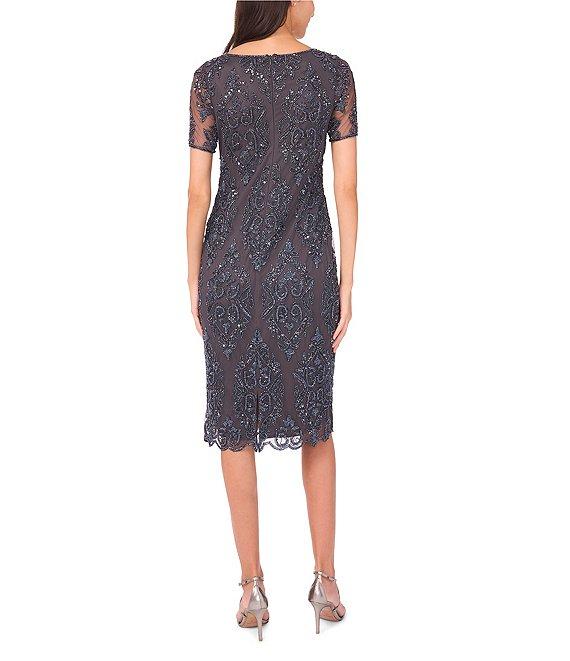 Pisarro Nights Boat Neck Short Sleeve Beaded Sheath Midi Dress